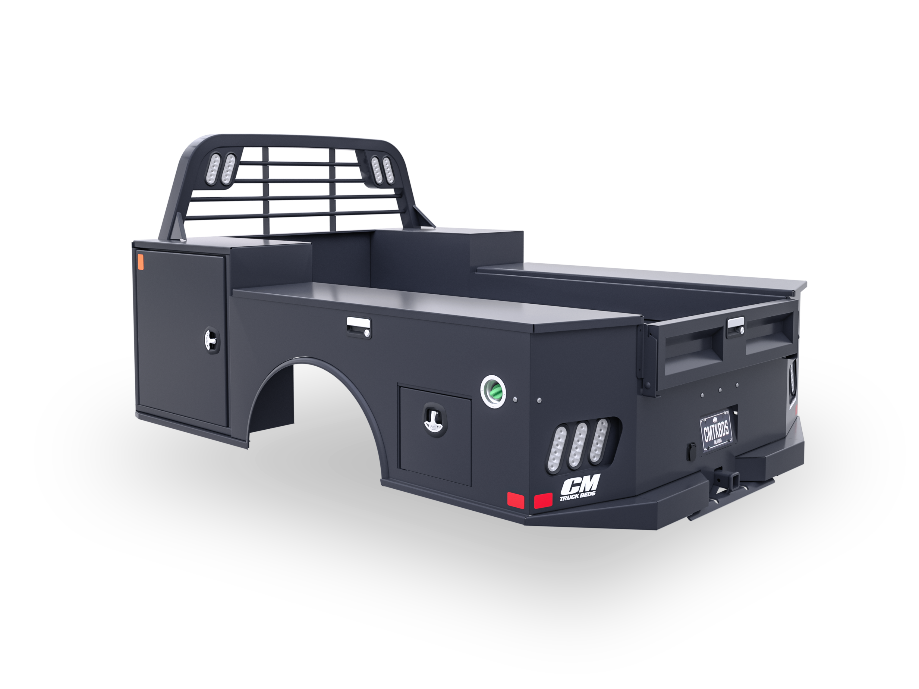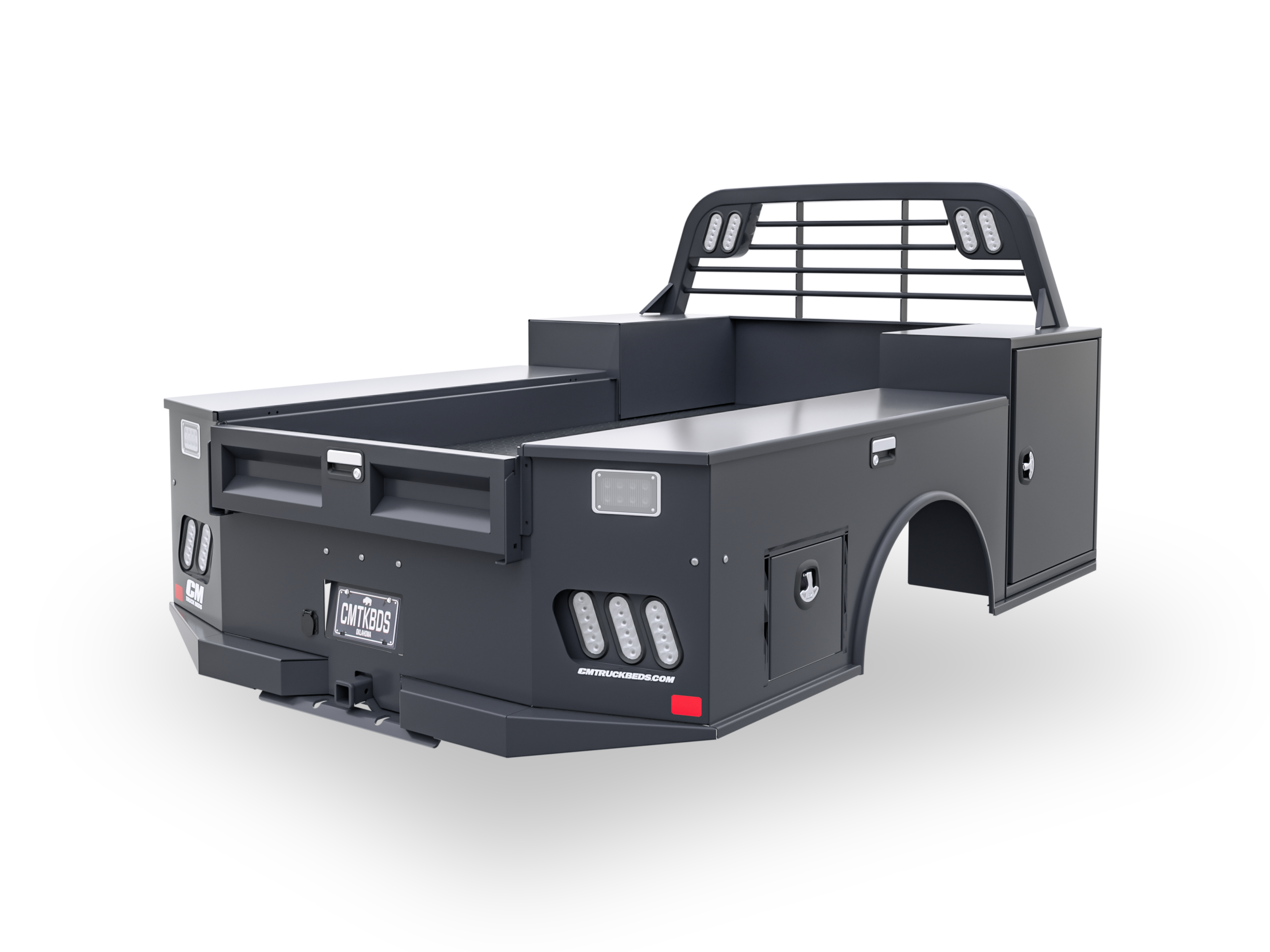 Designed to haul from bumper or gooseneck positions. Featuring an opossum belly, work light, a tall rear toolbox and a 48” wide deck, the TMX is great for single wheel chassis.