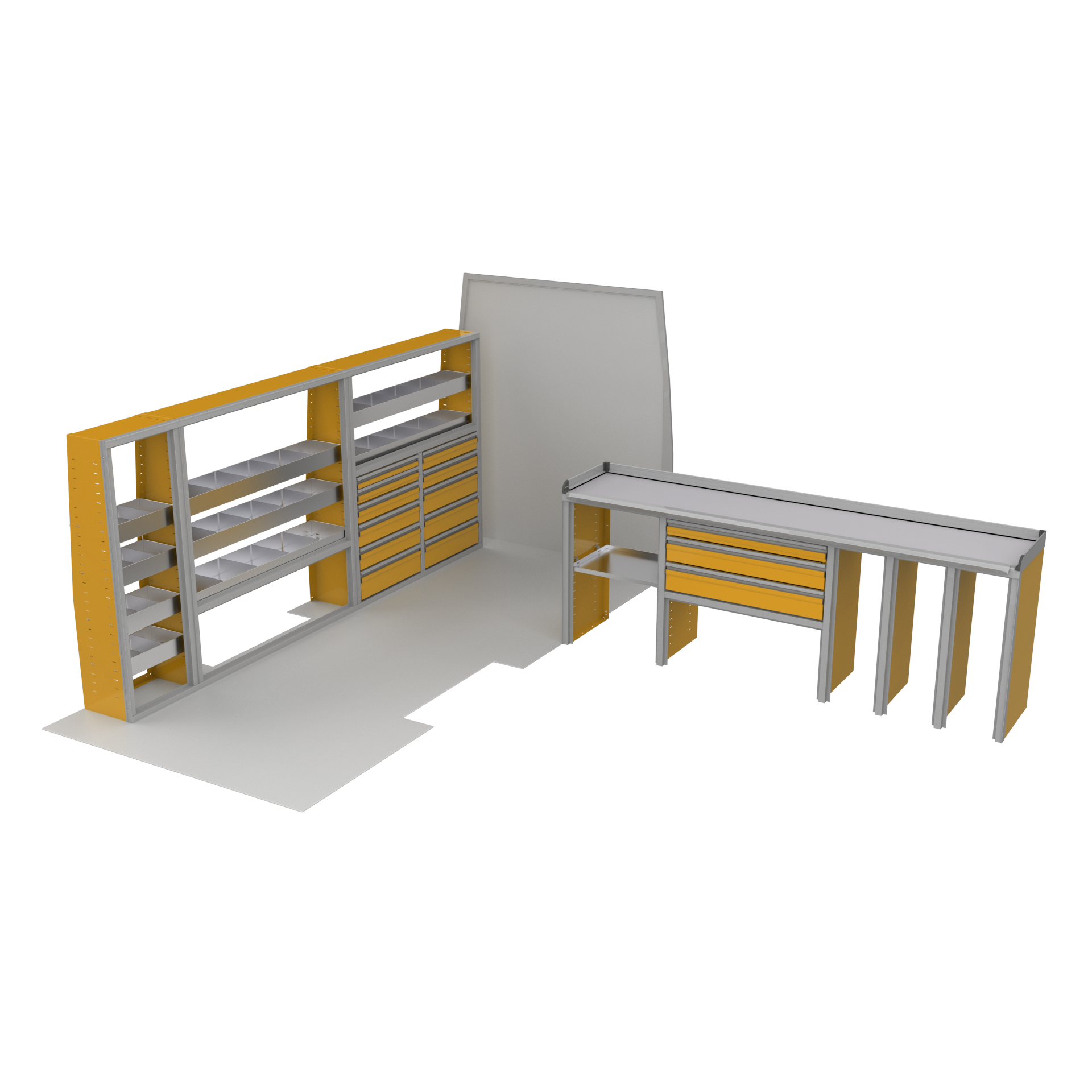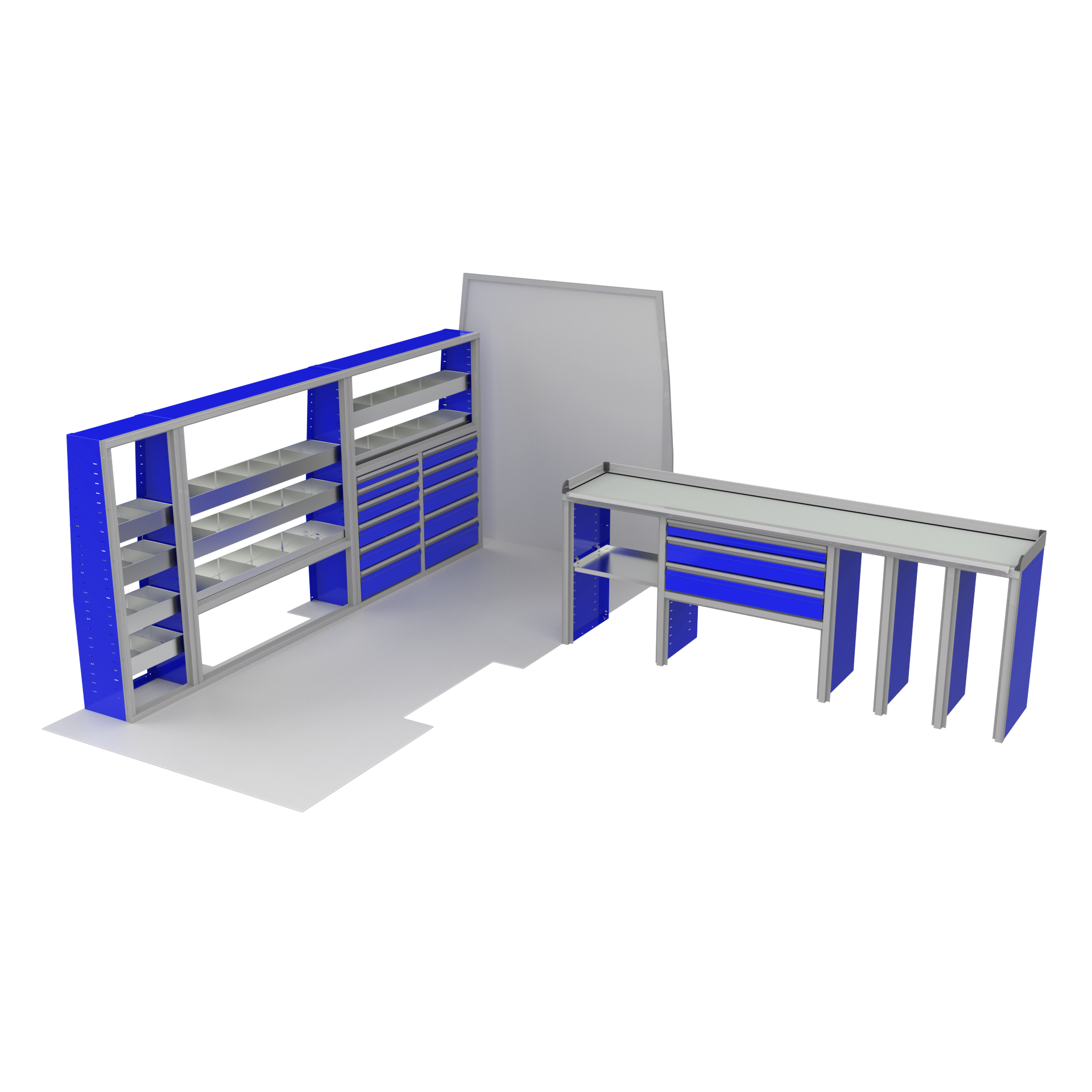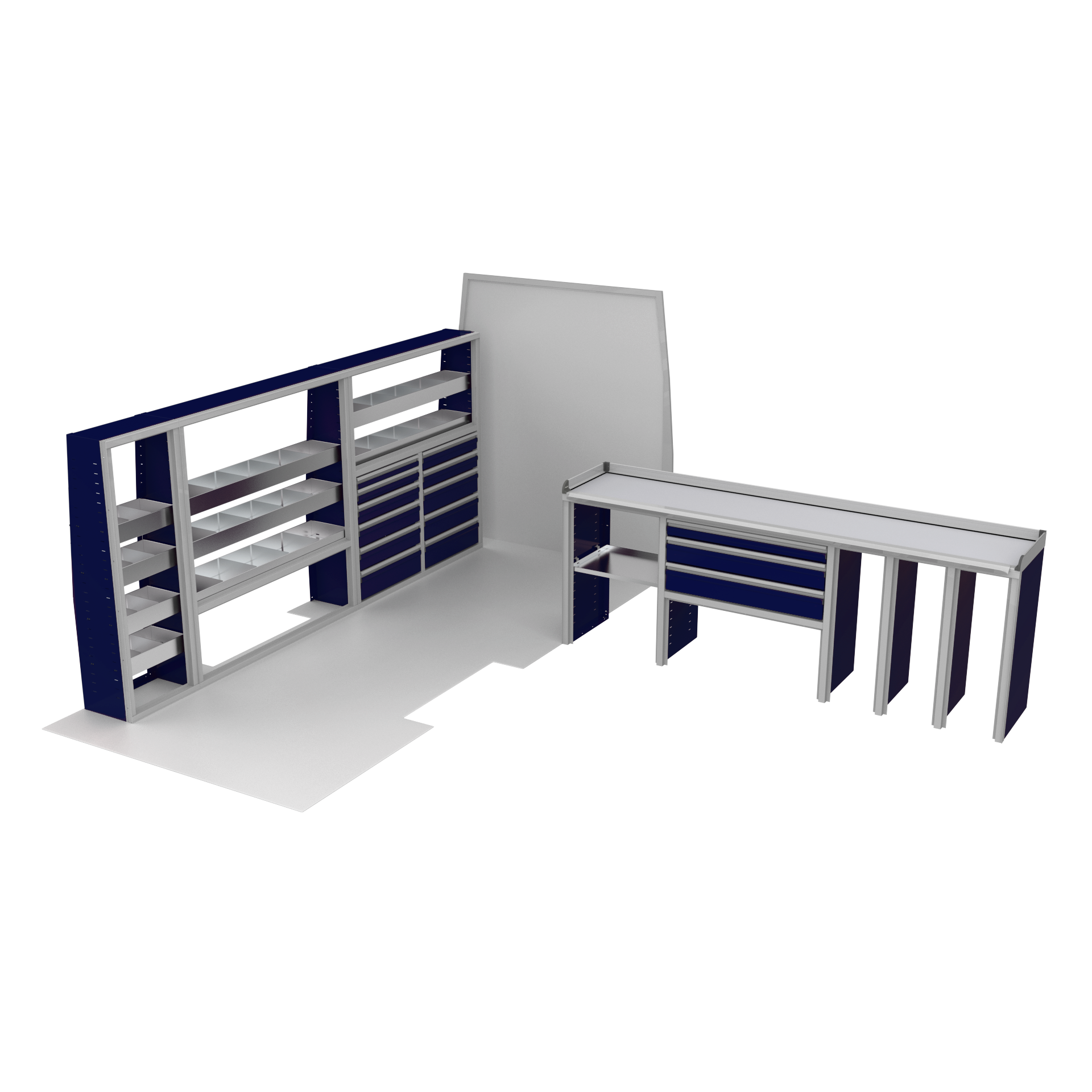 Take your Ford Transit 150/250/350 Extended to the next level with the VanPro Package FTEXT3, designed for medium or high roof models. This all-in-one storage solution features multiple shelving units and a durable workbench, creating a highly efficient mobile workspace. Built from lightweight, corrosion-resistant aluminum, this package ensures that tools, materials, and equipment stay secure and organized, even on the move.