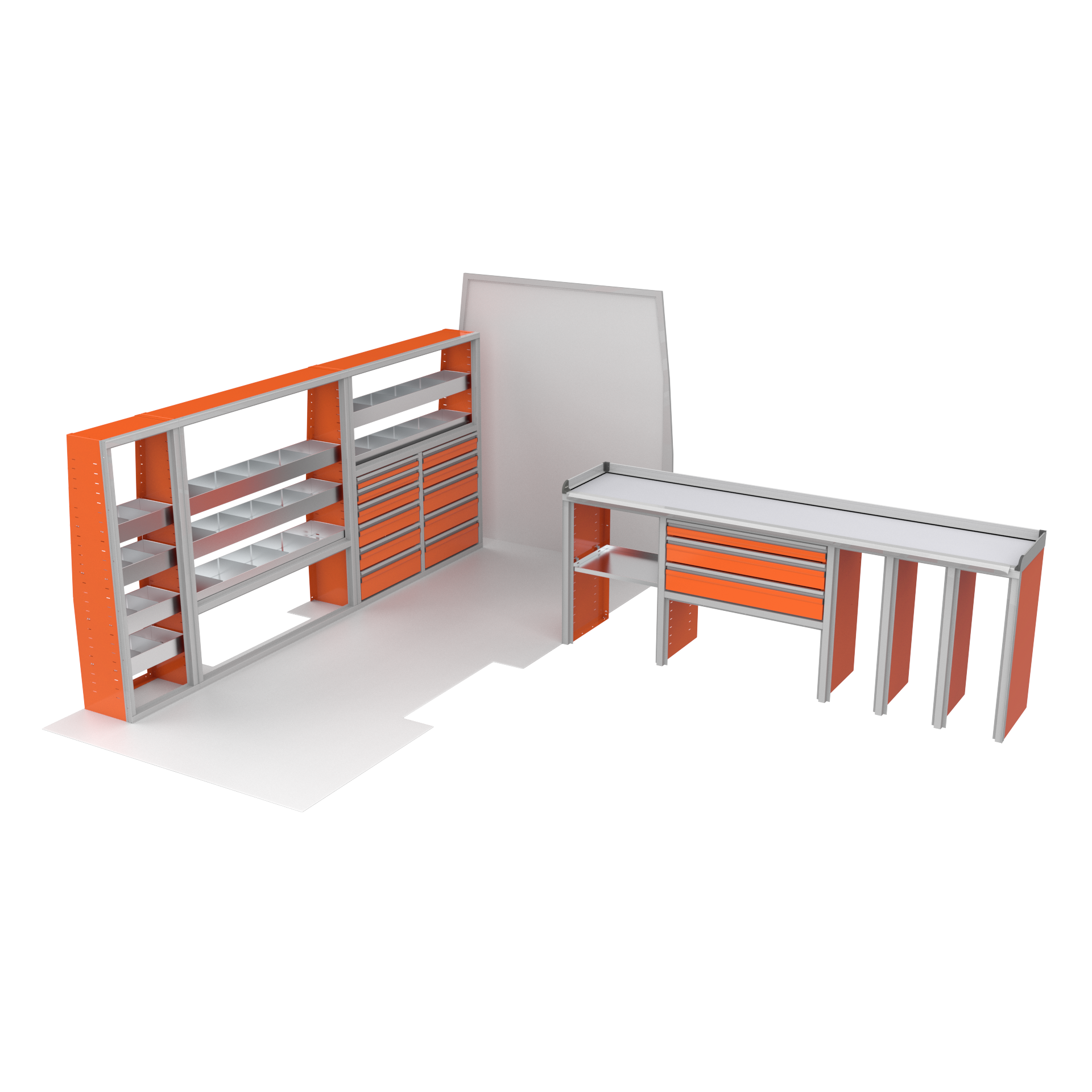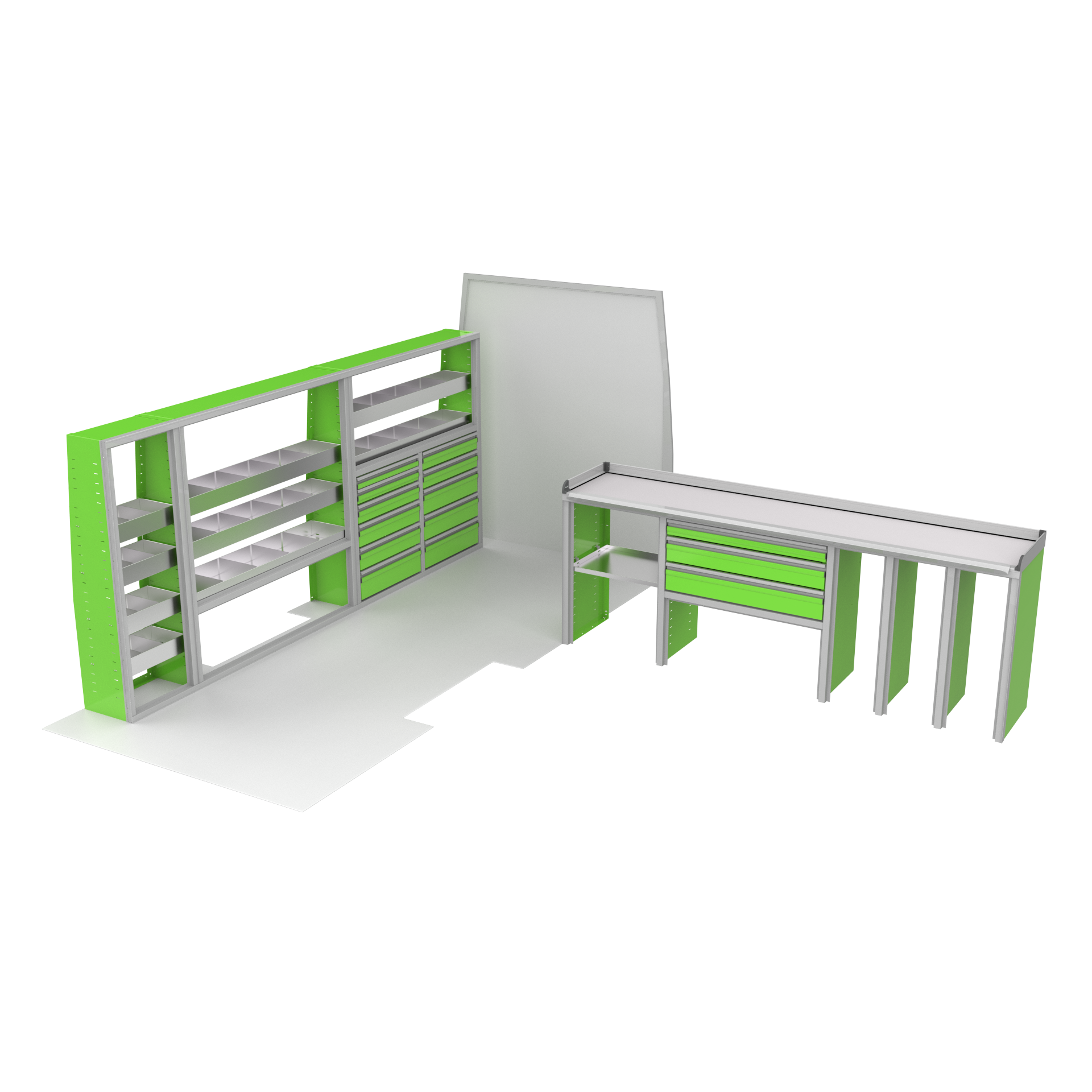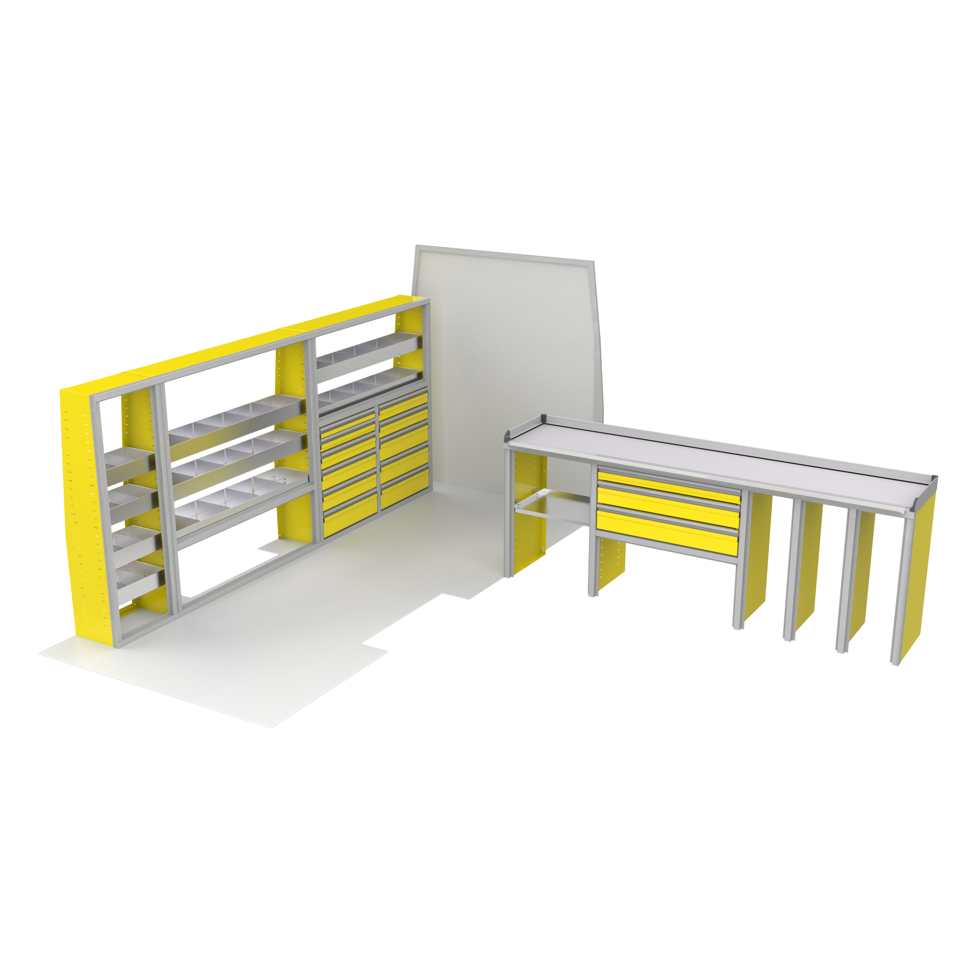 Take your Ford Transit 150/250/350 Extended to the next level with the VanPro Package FTEXT3, designed for medium or high roof models. This all-in-one storage solution features multiple shelving units and a durable workbench, creating a highly efficient mobile workspace. Built from lightweight, corrosion-resistant aluminum, this package ensures that tools, materials, and equipment stay secure and organized, even on the move.