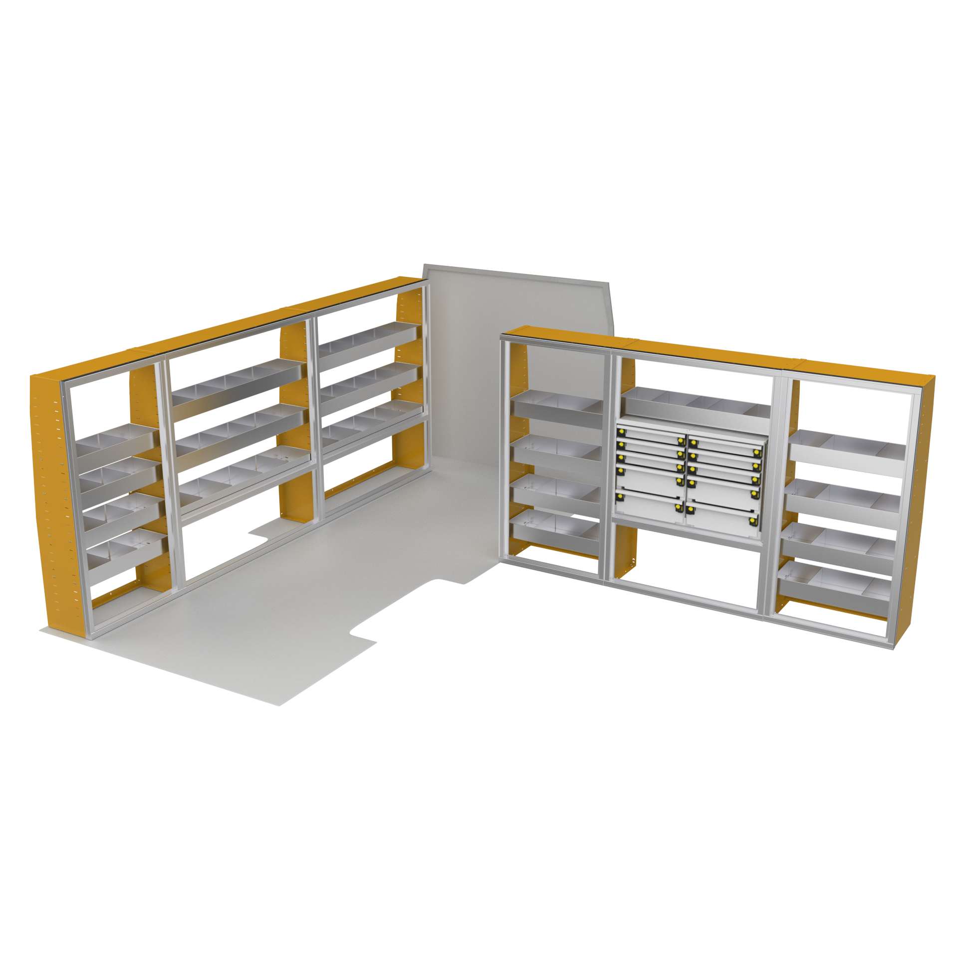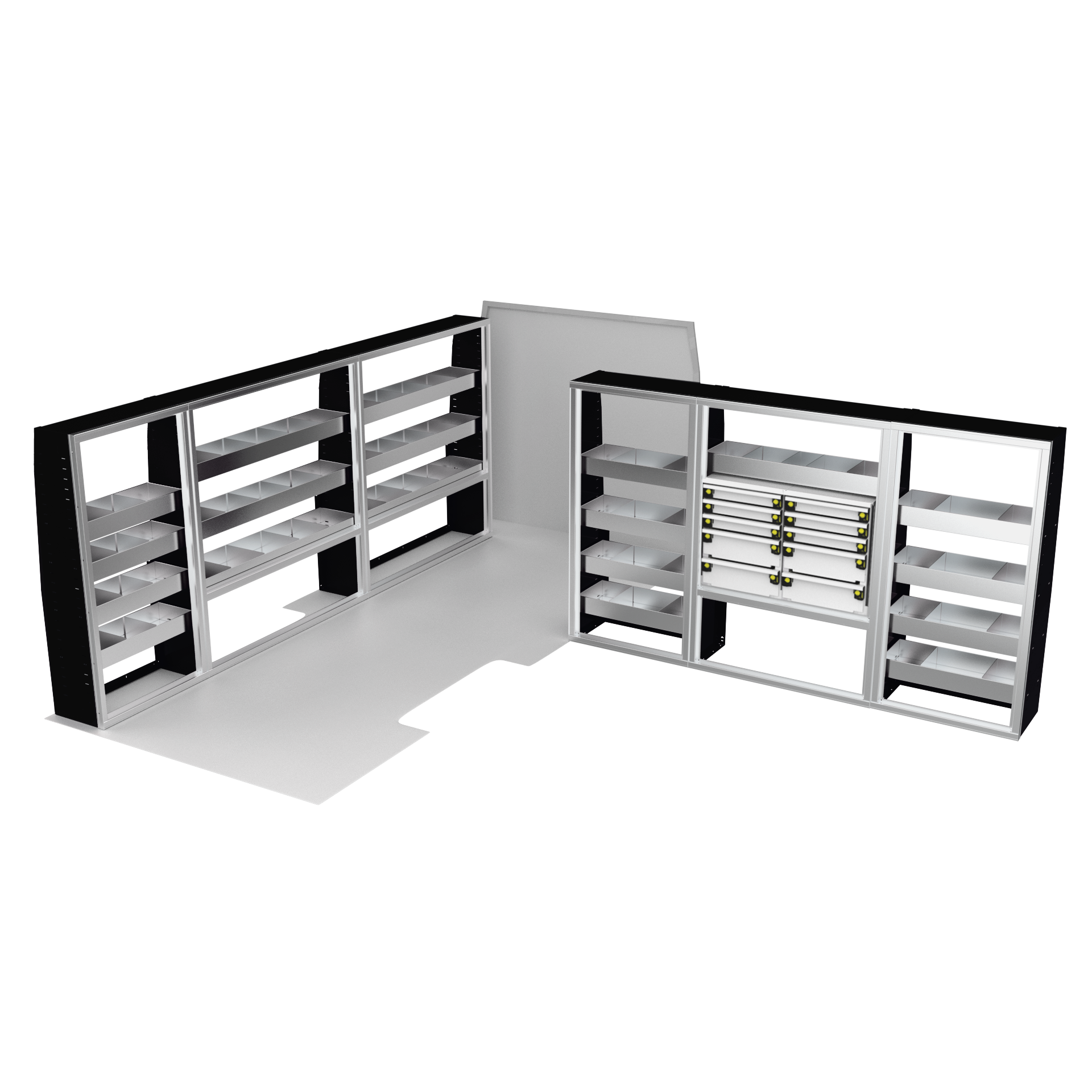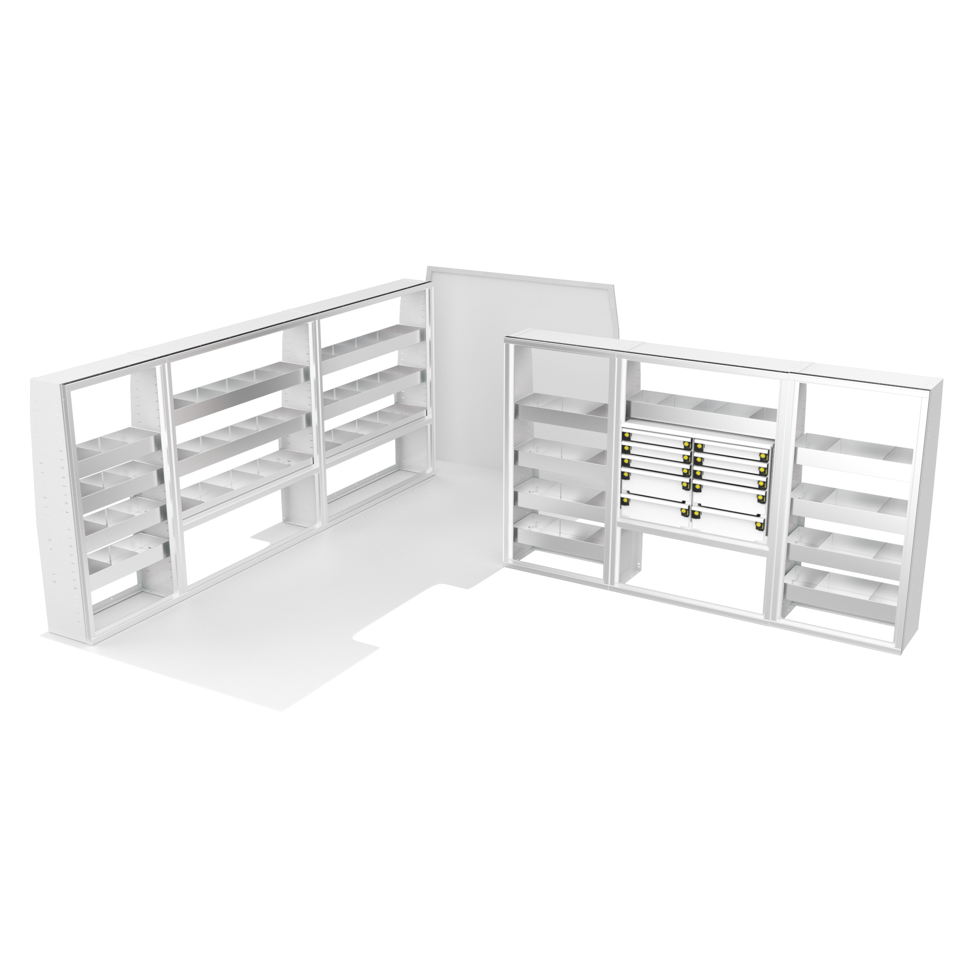 The VanPro Package ML1 for Mercedes Sprinter 170 combines the MS300 Shelving Unit, MS301 MotionGlide Shelving Unit, MS305 Shelving Unit, and MS306 Shelving Unit to provide an all-encompassing storage solution for your work van. Featuring custom deep shelves, adjustable shelves, motion-controlled shelving, and dividers for enhanced organization, this package is designed to maximize your storage space, ensuring tools and equipment are easily accessible and securely stored.