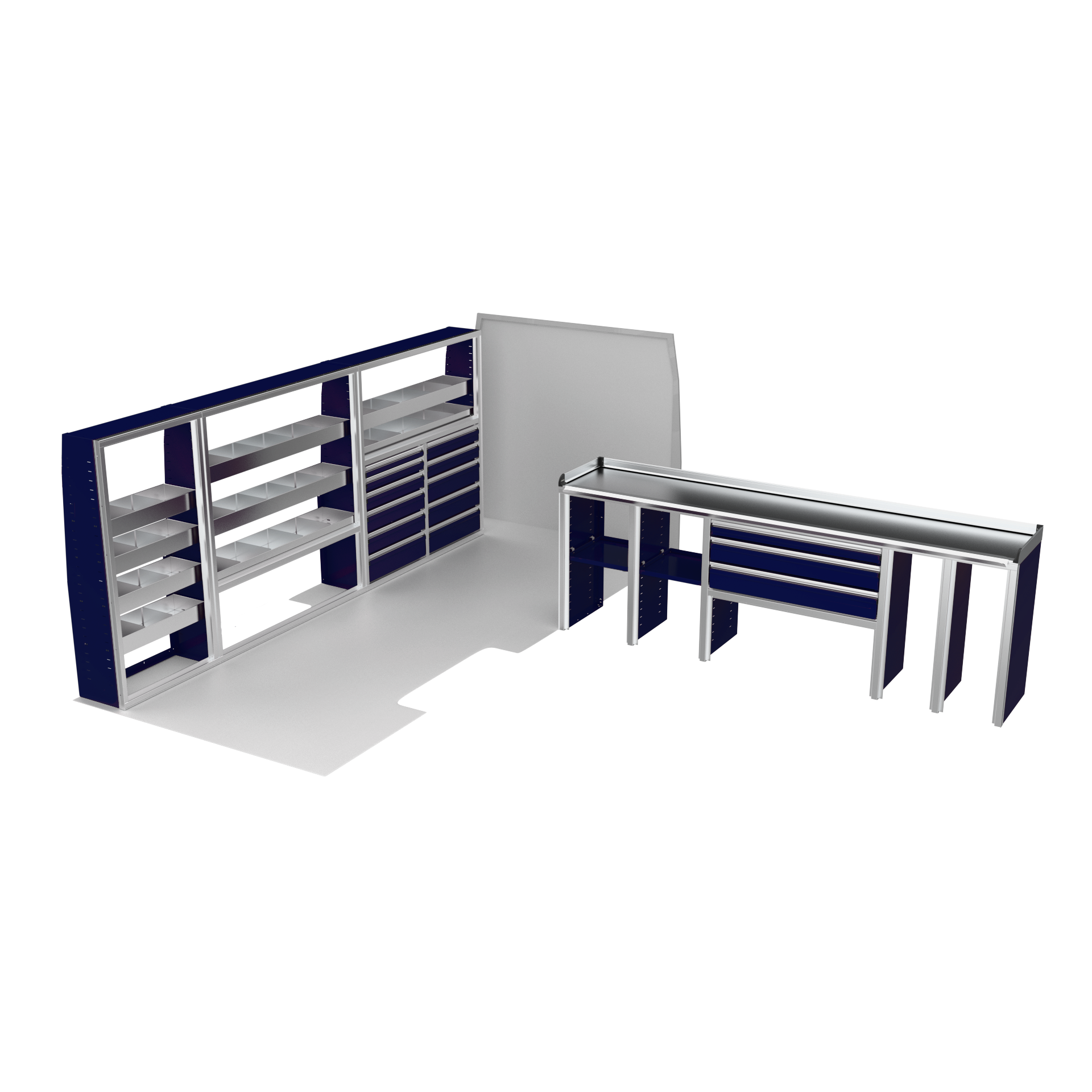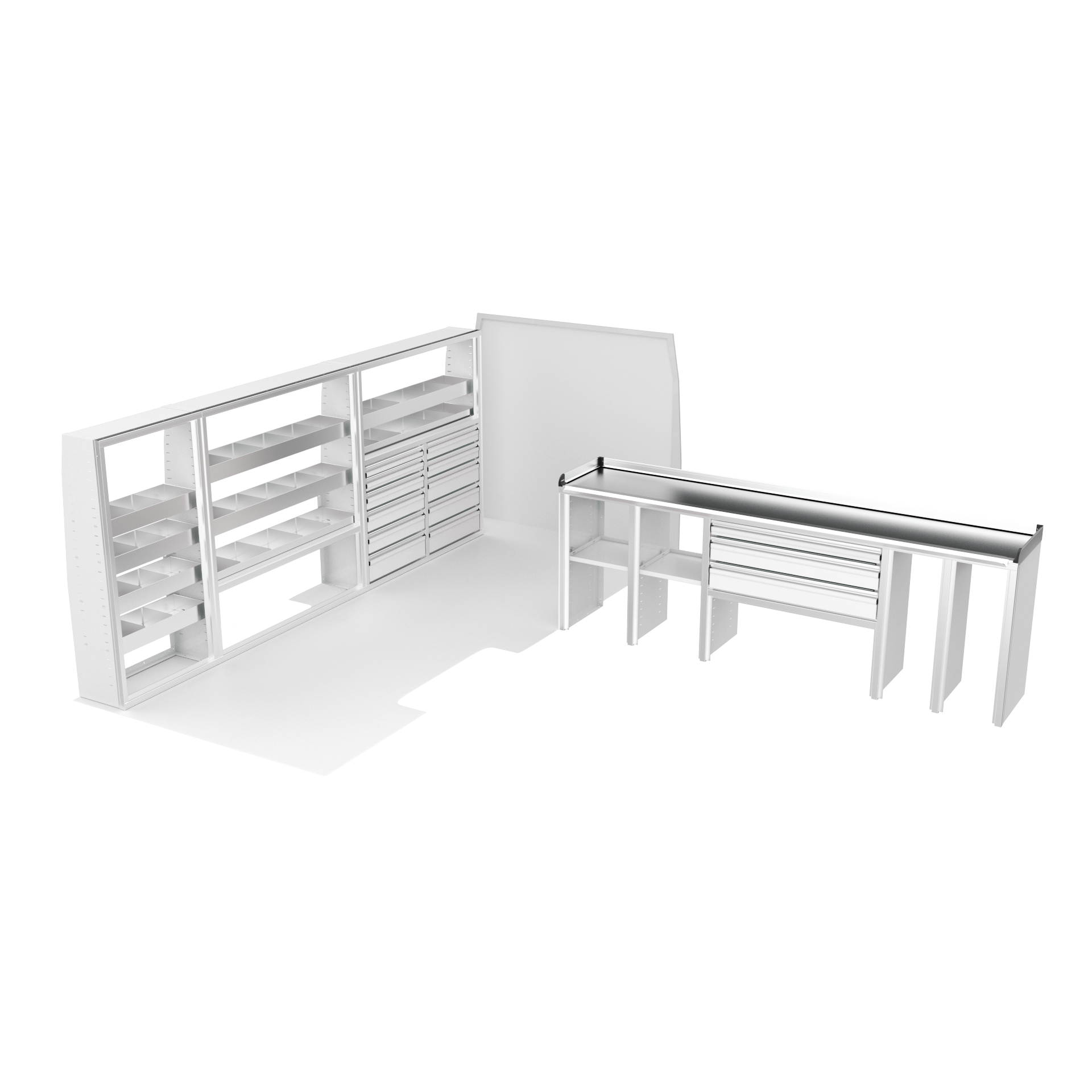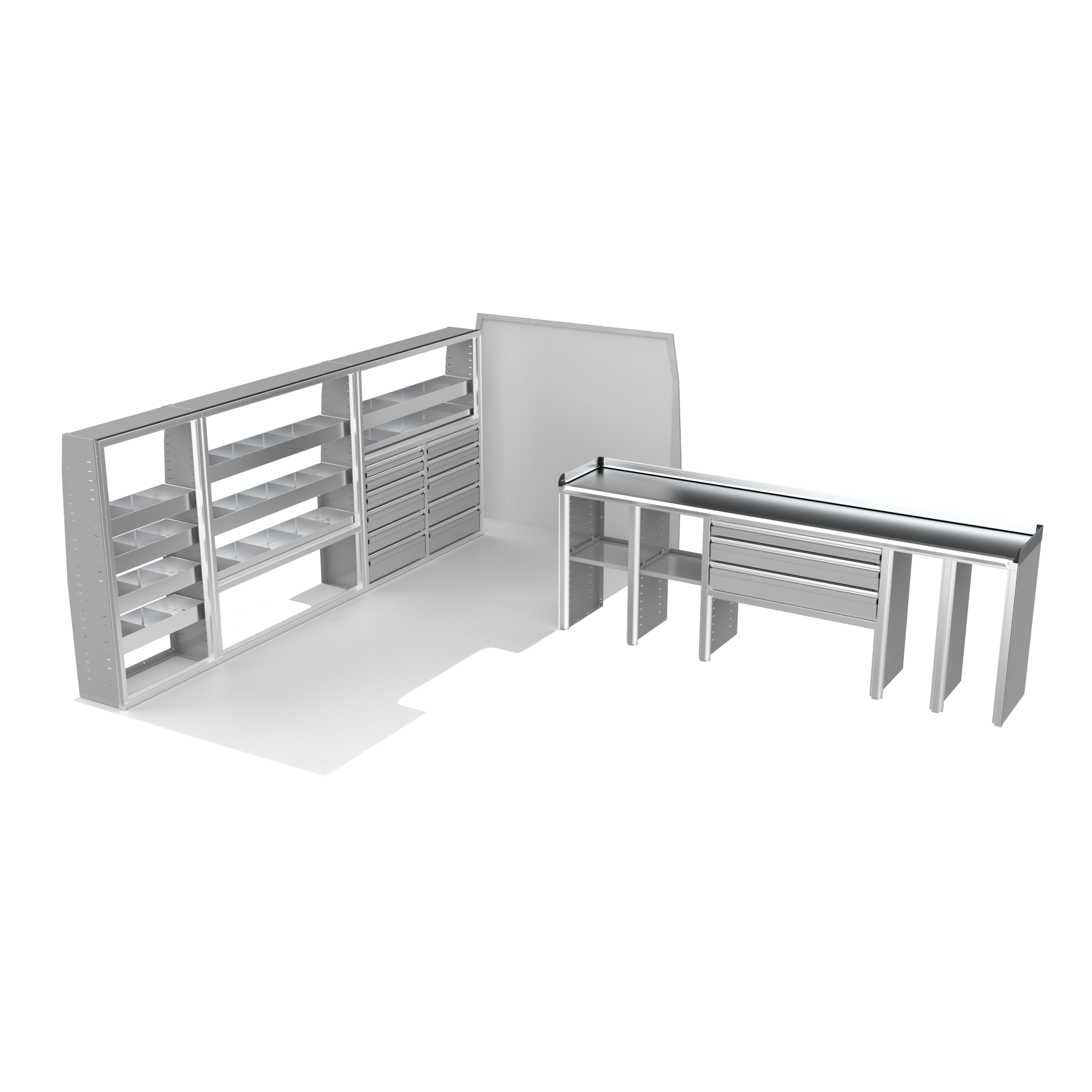 The VanPro Package ML3 for the Mercedes Sprinter 170 includes the MS300 Shelving Unit, MS305 Shelving Unit, MS312 Shelving Unit, and MS313 Workbench. This comprehensive package provides a perfect blend of customizable shelving, versatile storage options, and a high-performance workbench with motion-controlled drawers, all designed to maximize space and organization in your van. Tailored specifically for the Mercedes Sprinter 170, this package ensures an efficient and organized mobile workspace for your business or job site.