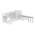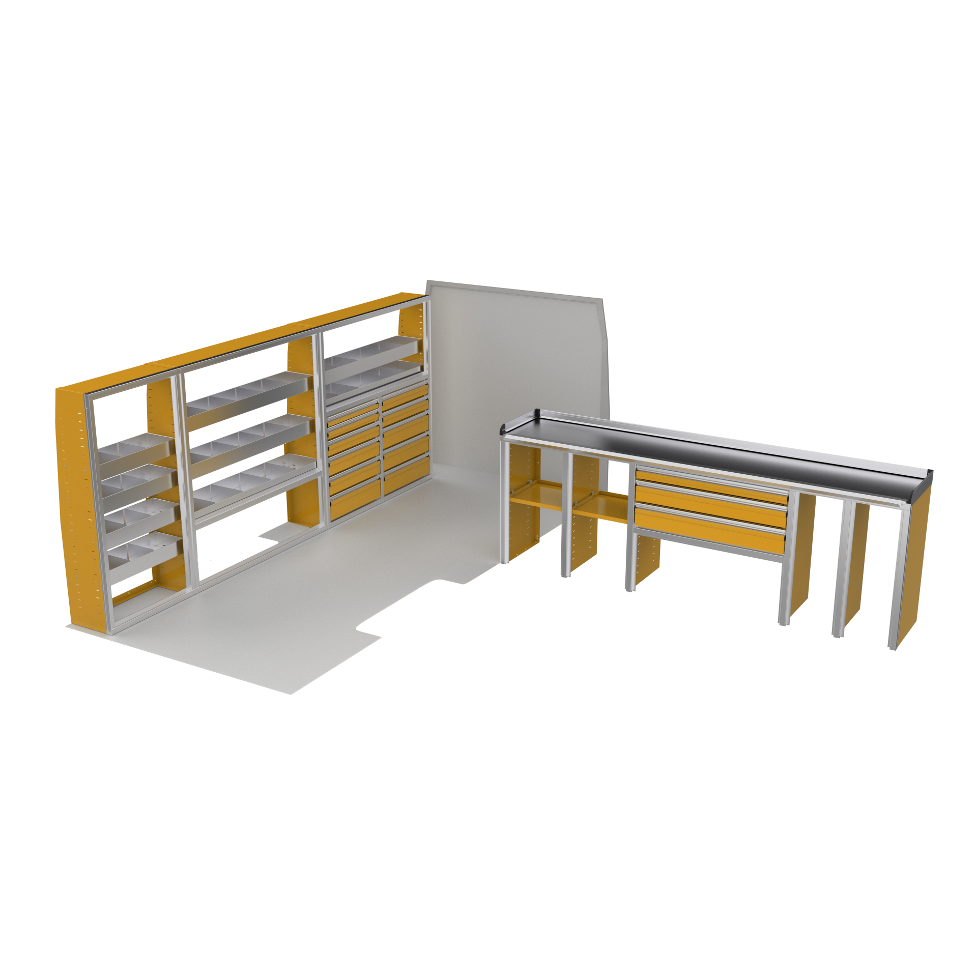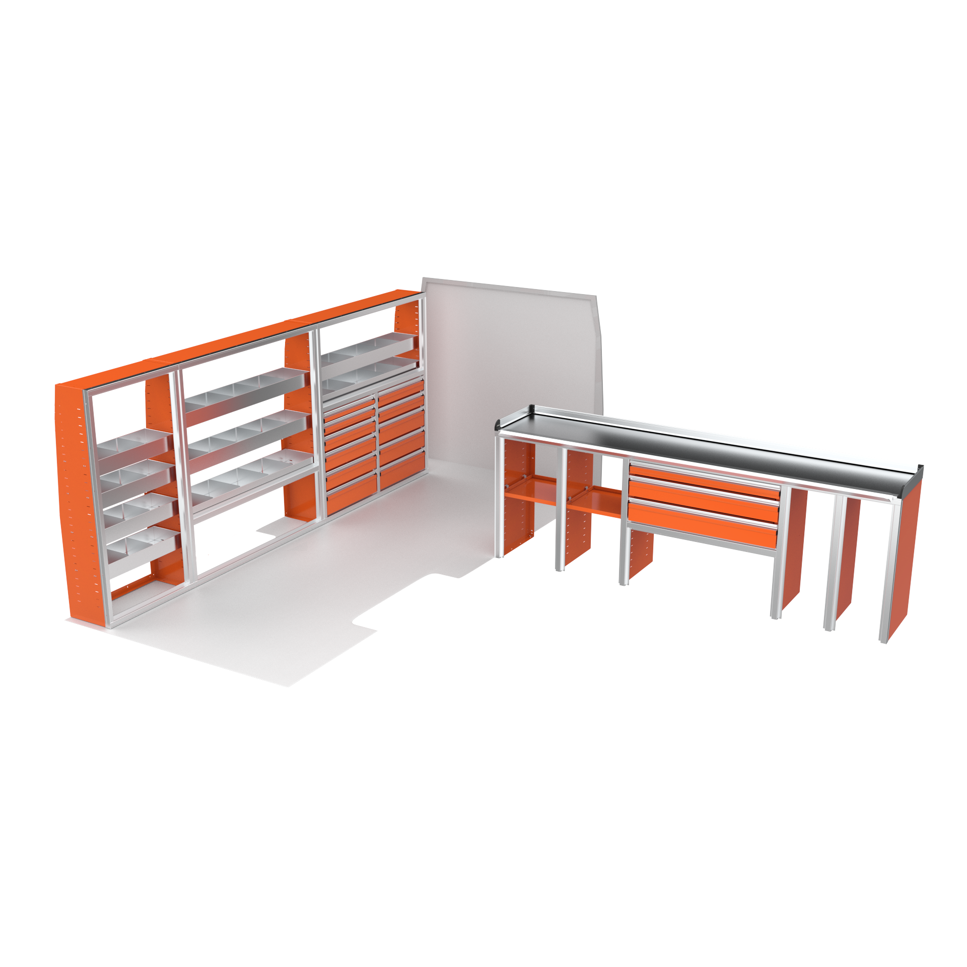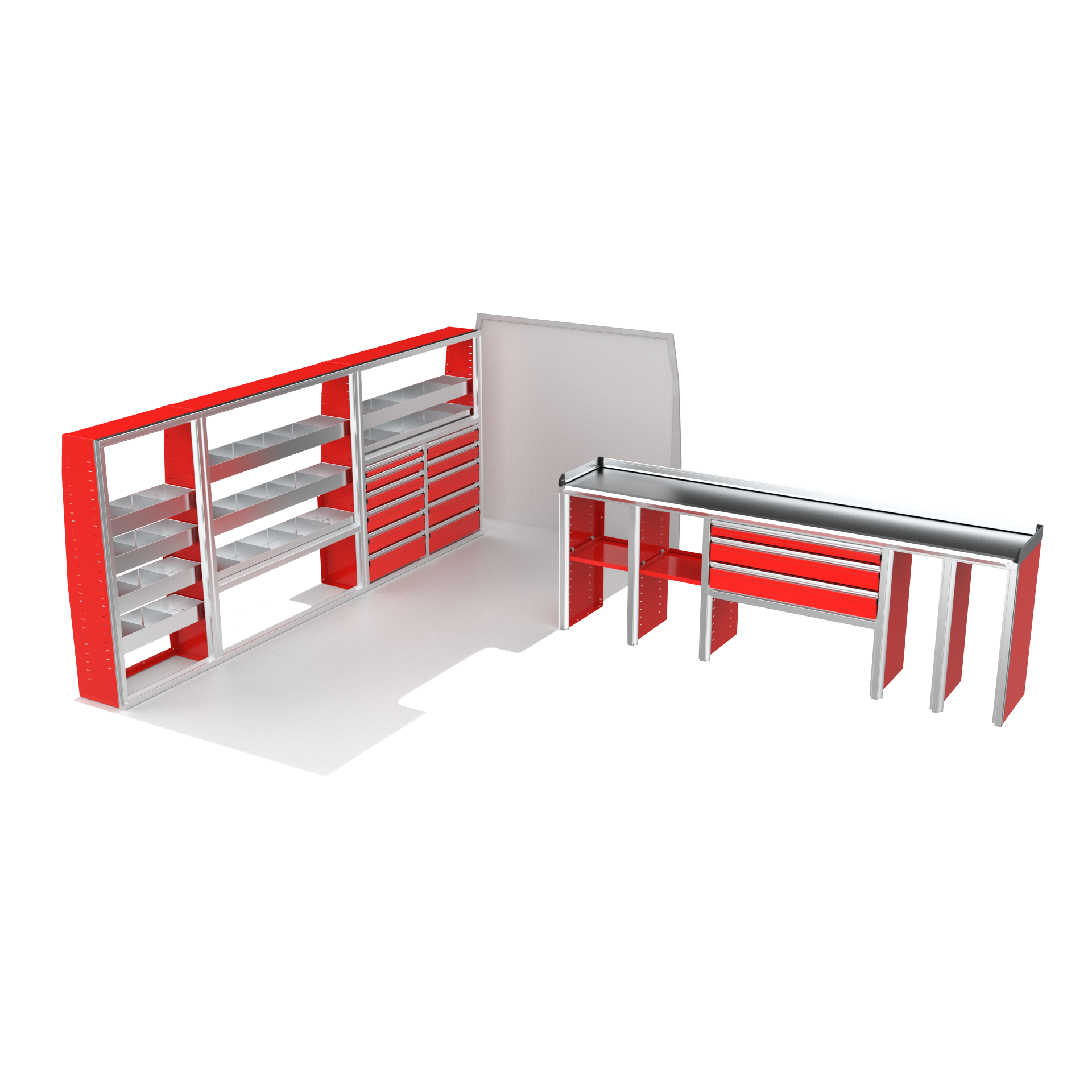The VanPro Package ML3 for the Mercedes Sprinter 170 includes the MS300 Shelving Unit, MS305 Shelving Unit, MS312 Shelving Unit, and MS313 Workbench. This comprehensive package provides a perfect blend of customizable shelving, versatile storage options, and a high-performance workbench with motion-controlled drawers, all designed to maximize space and organization in your van. Tailored specifically for the Mercedes Sprinter 170, this package ensures an efficient and organized mobile workspace for your business or job site.