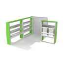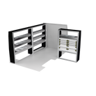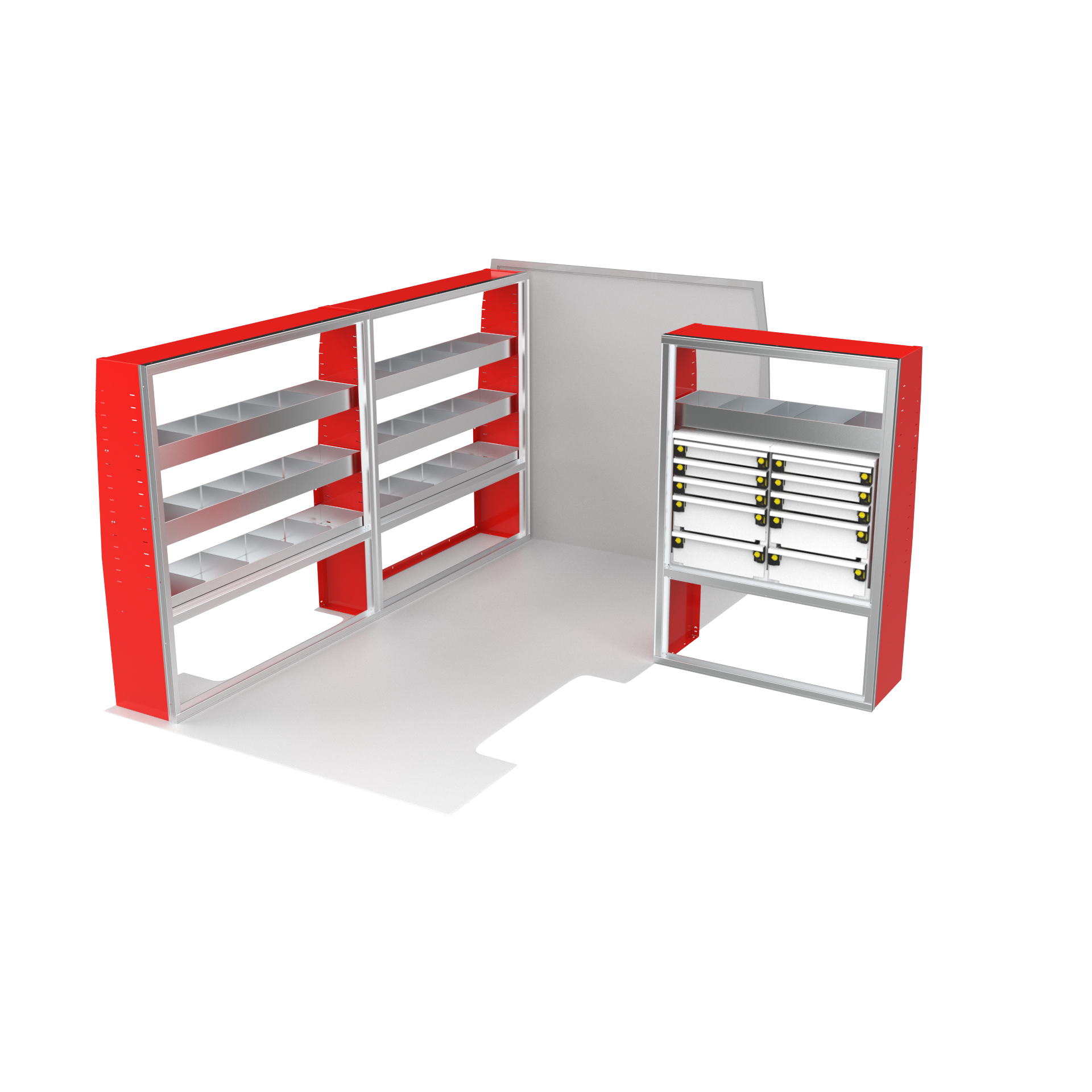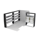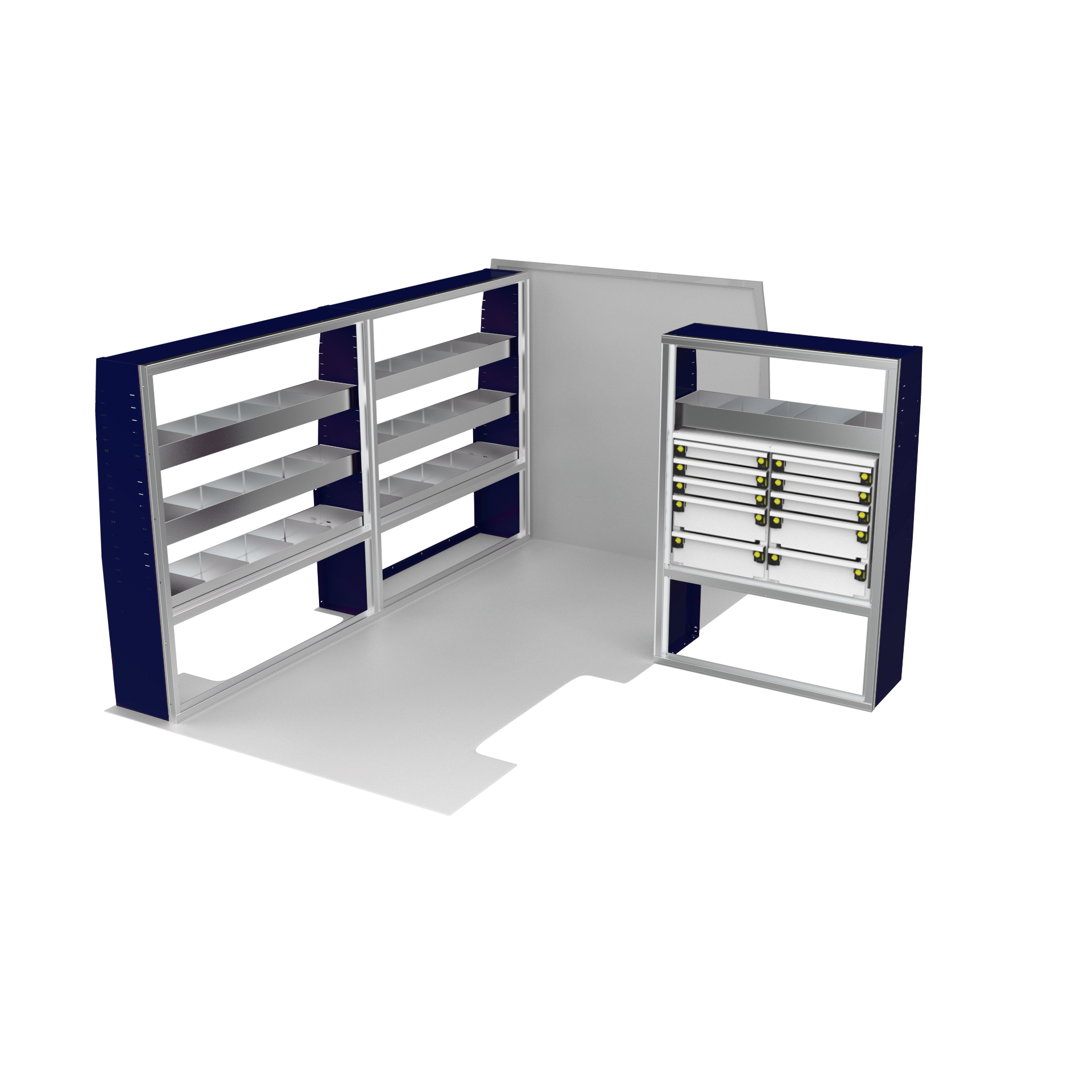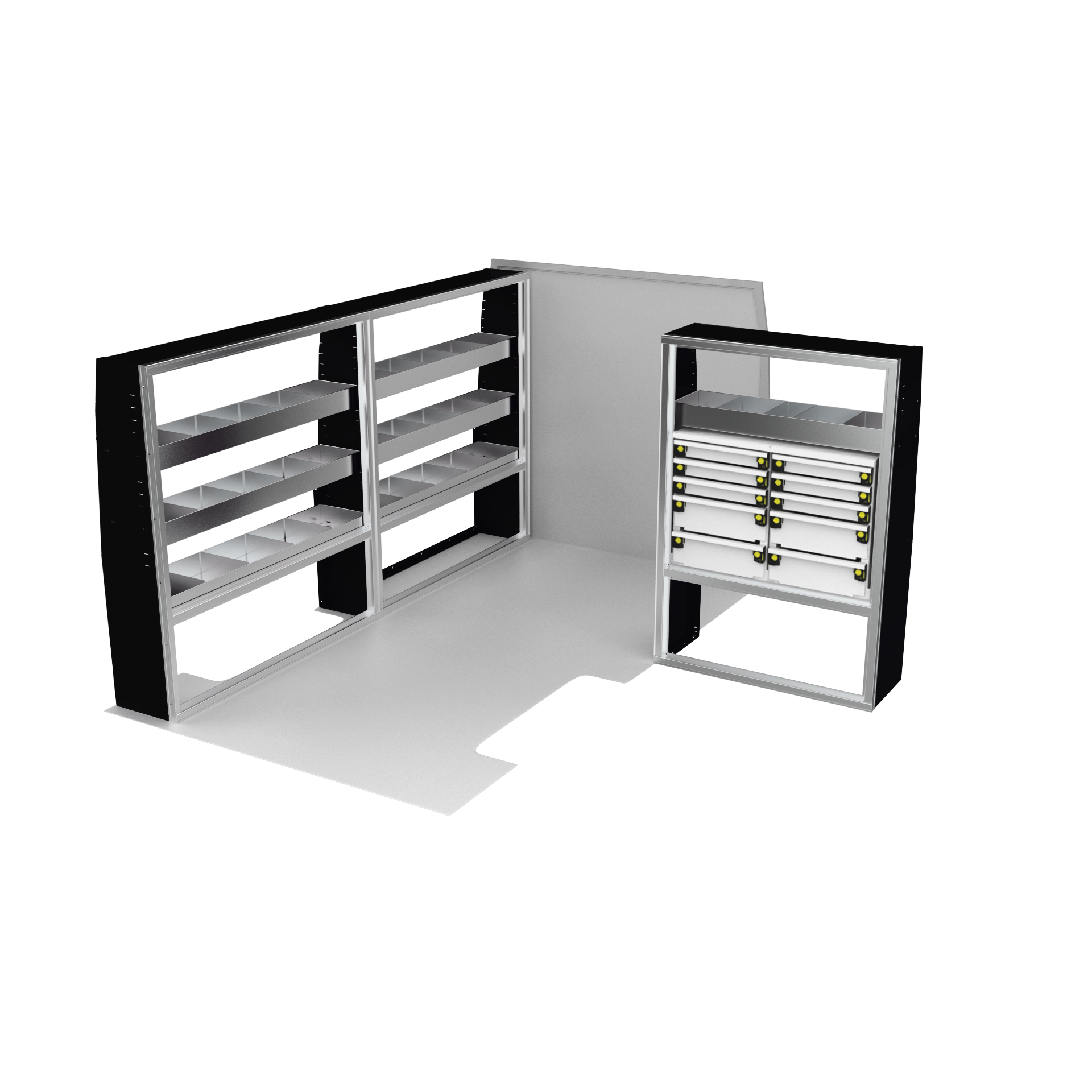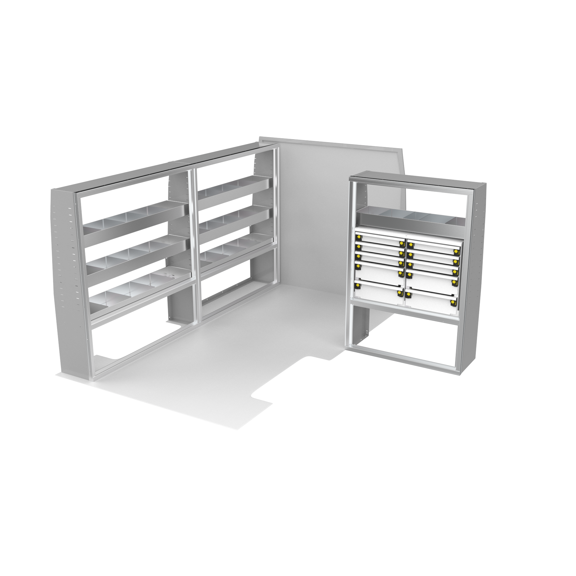 The VanPro Package RPEXT1 combines the RP300, RP-301, RP-305, and RP-306 units, offering a complete storage solution for the Ram ProMaster 2500/3500 EXT. This package includes adjustable shelving, MotionGlide technology, open-face shelving, and secure drawers for flexible, efficient storage. Made from lightweight, corrosion-resistant aluminum, it maximizes your van's storage capacity while providing durable and easy-to-move organization for mobile businesses and service professional.