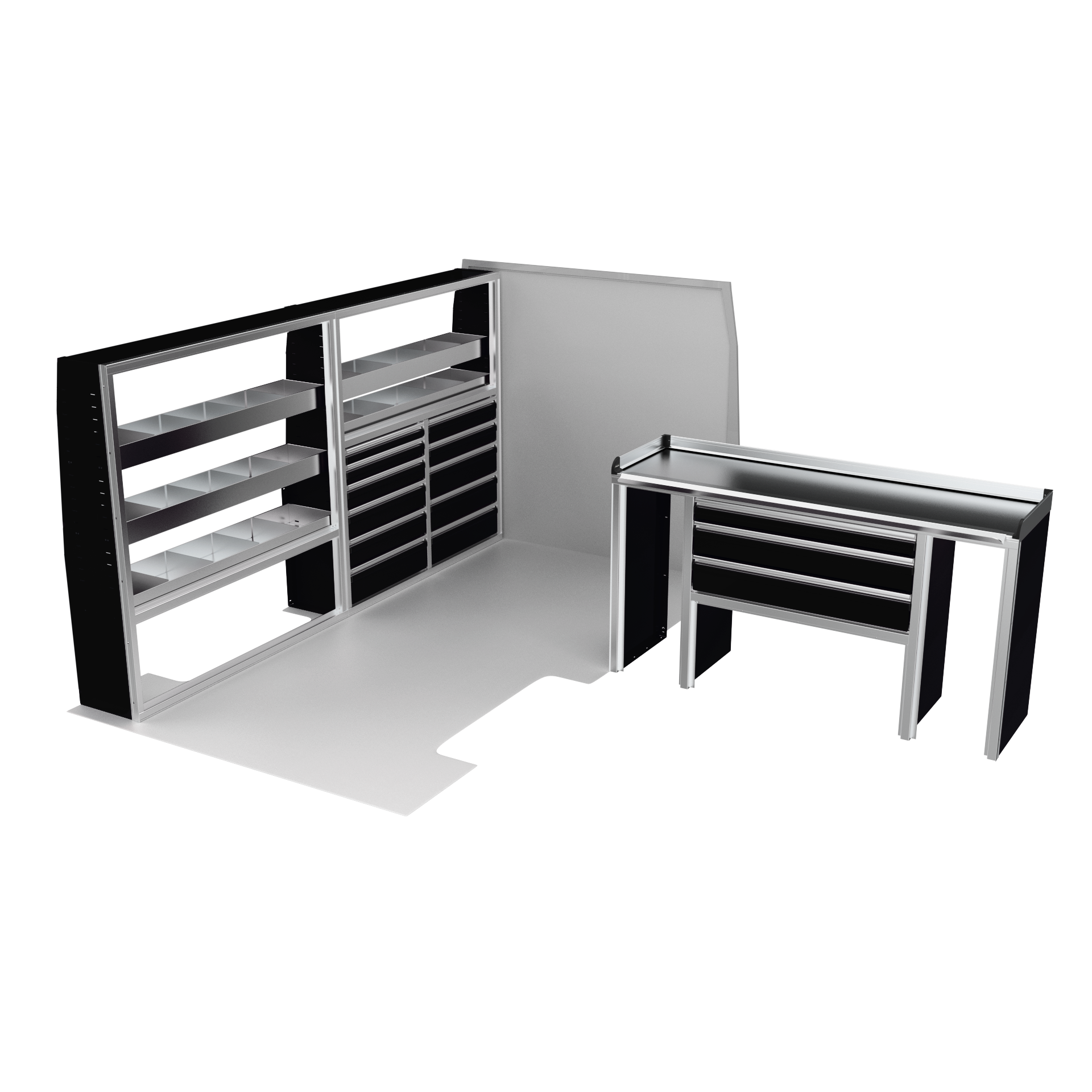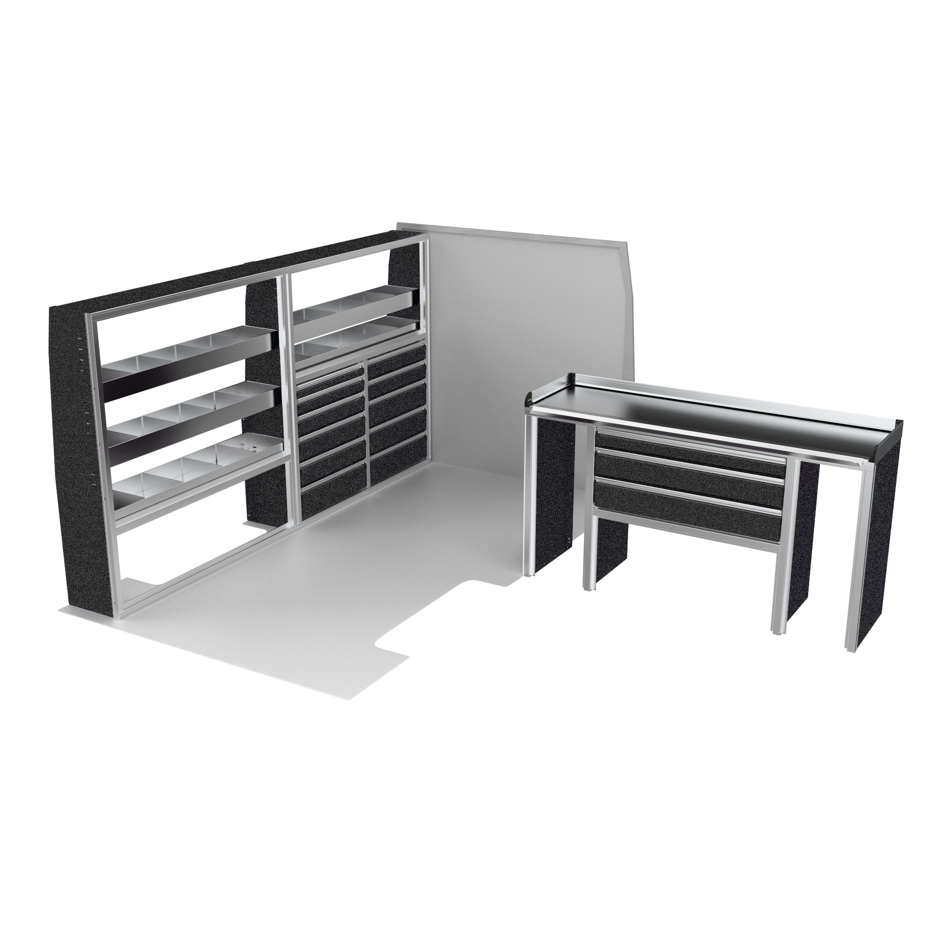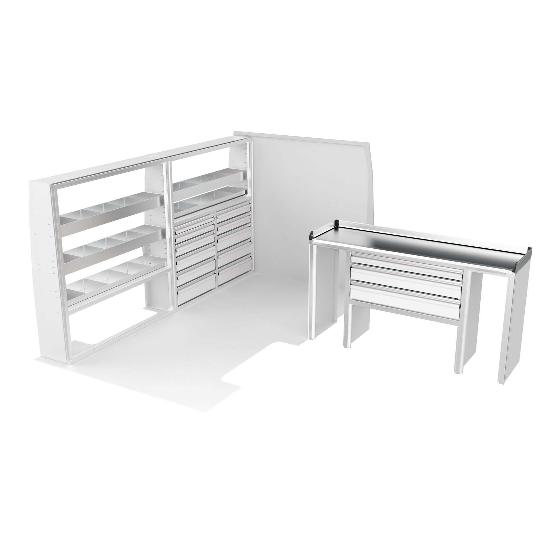 The VanPro Package MS3 for the Mercedes Sprinter 144 includes the MS300 Shelving Unit, MS311 Workbench, and MS312 Shelving Unit. This package offers a combination of customizable shelving, a high-performance workbench with motion-controlled drawers, and additional storage options to enhance organization and accessibility. Designed specifically for the Mercedes Sprinter 144, it provides a complete solution for optimizing your van’s workspace, making it perfect for any mobile business or job site.