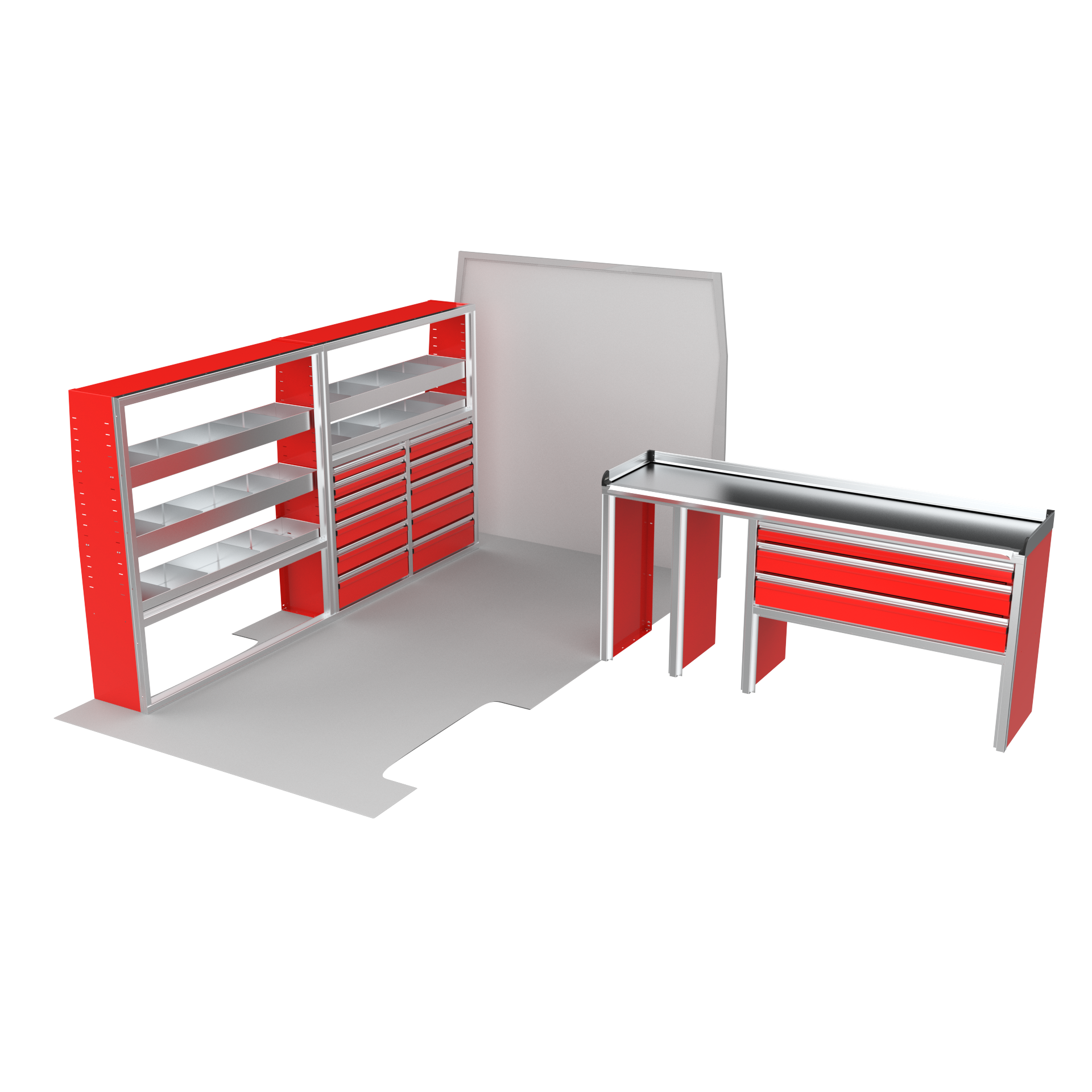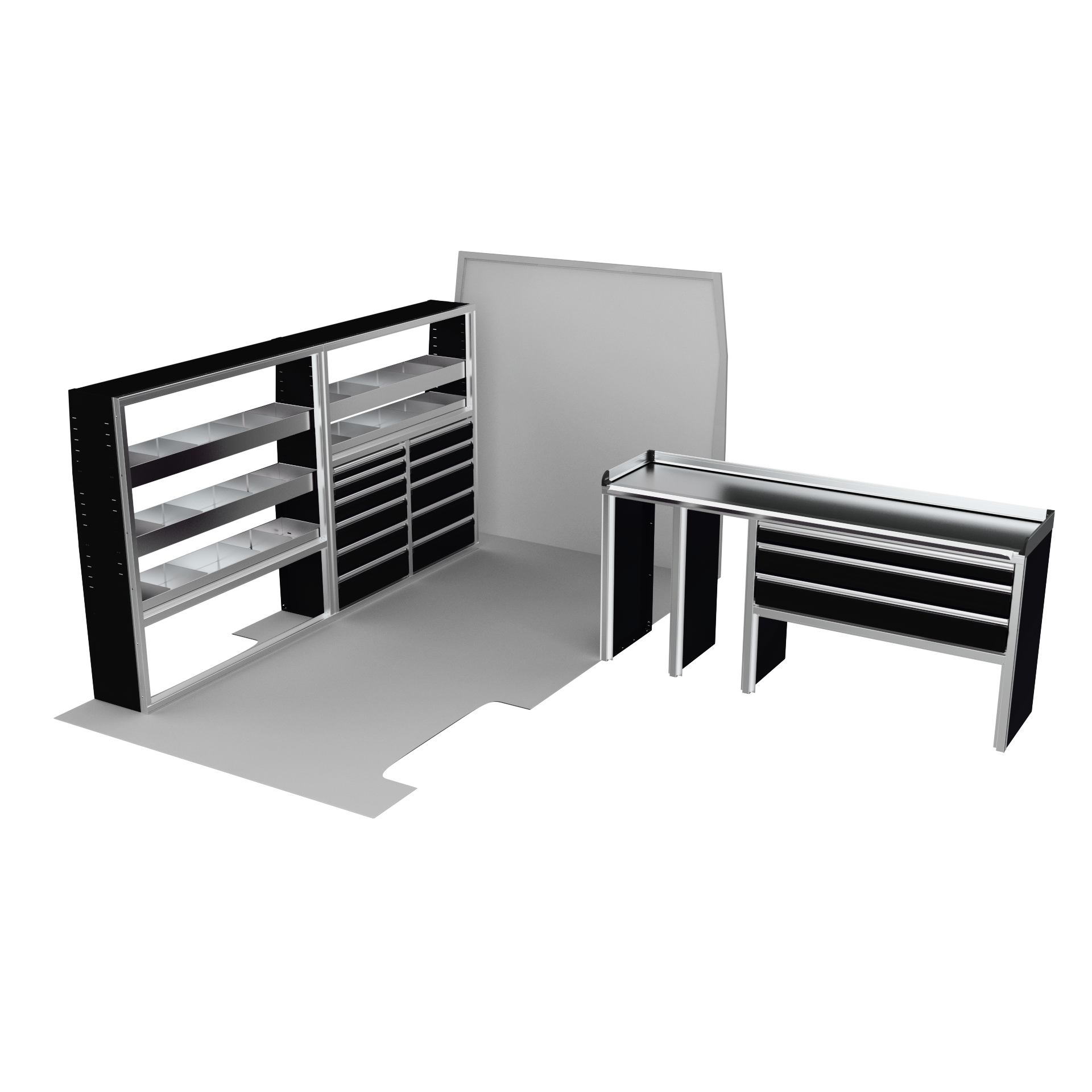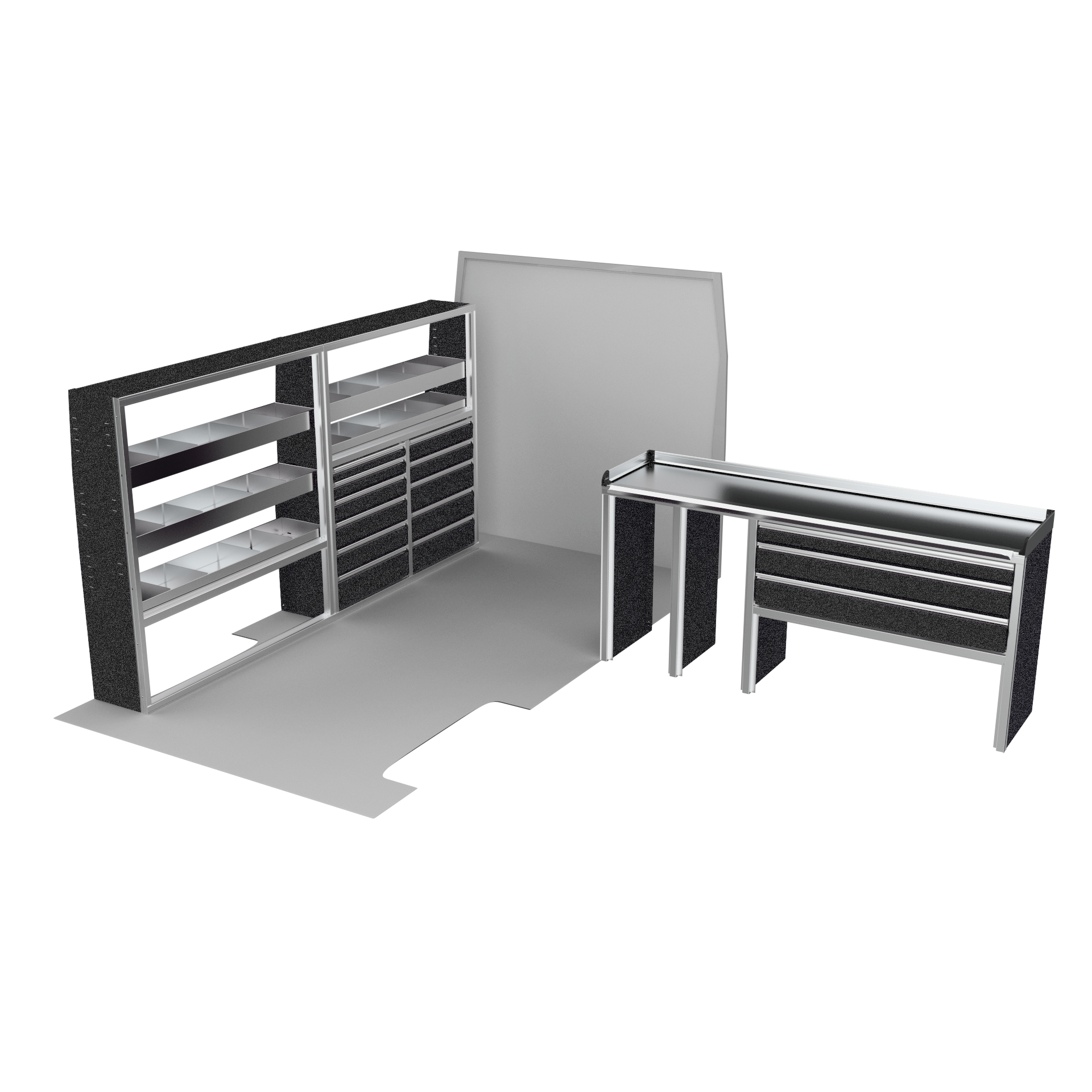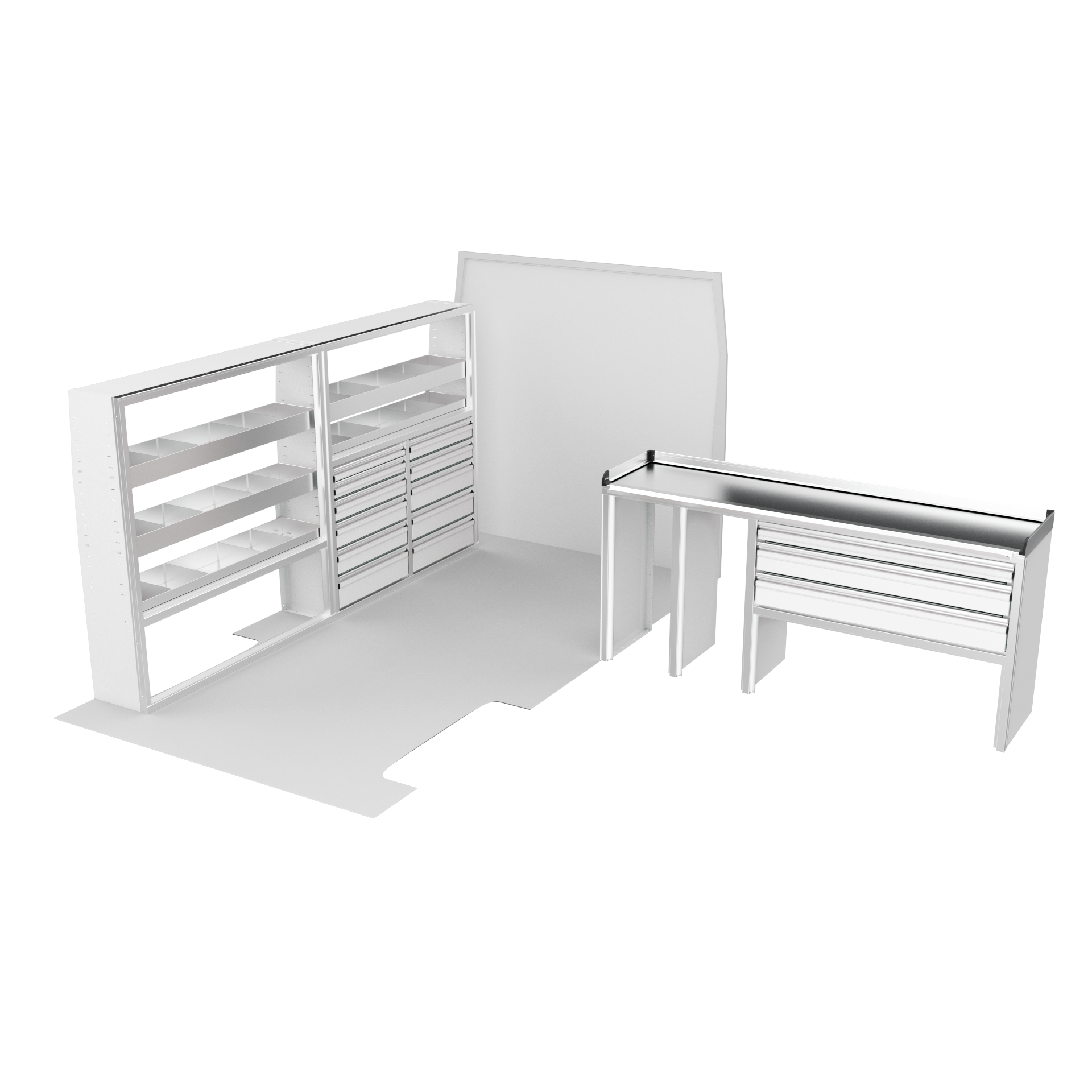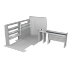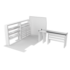 The VanPro Package RP2 includes the RP-300 Shelving Unit, RP-301 Shelving Unit, RP-303 Workbench, and RP-304 Drawer Housing for a comprehensive, efficient storage and workspace solution. Designed for the Ram ProMaster 2500/3500, this package features adjustable shelving, MotionGlide technology, and MotionLatch™ drawers for secure, easy-access organization. Constructed from lightweight, corrosion-resistant aluminum, it offers long-lasting durability, providing the flexibility and reliability your work van needs.