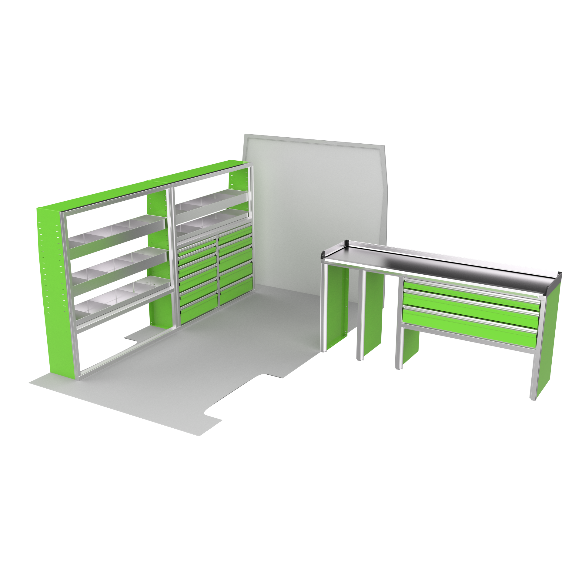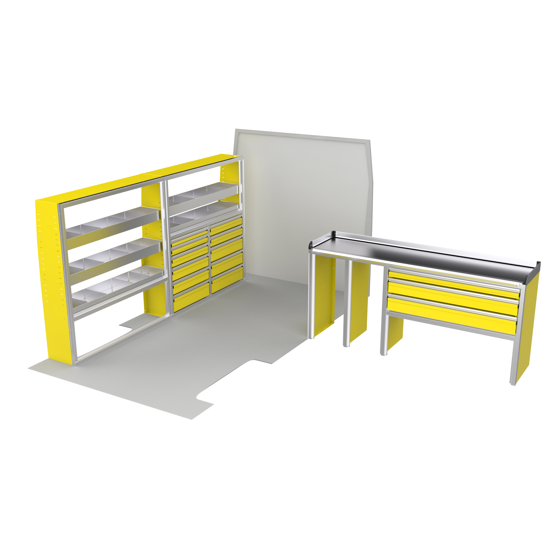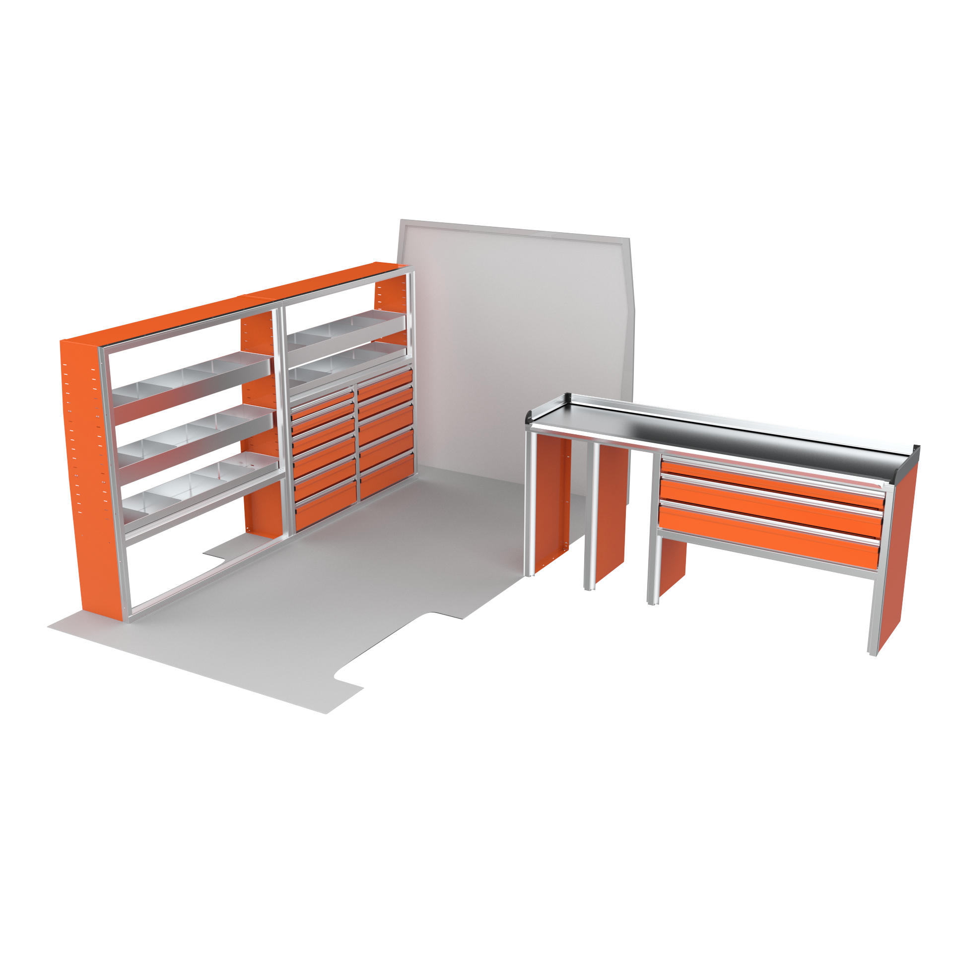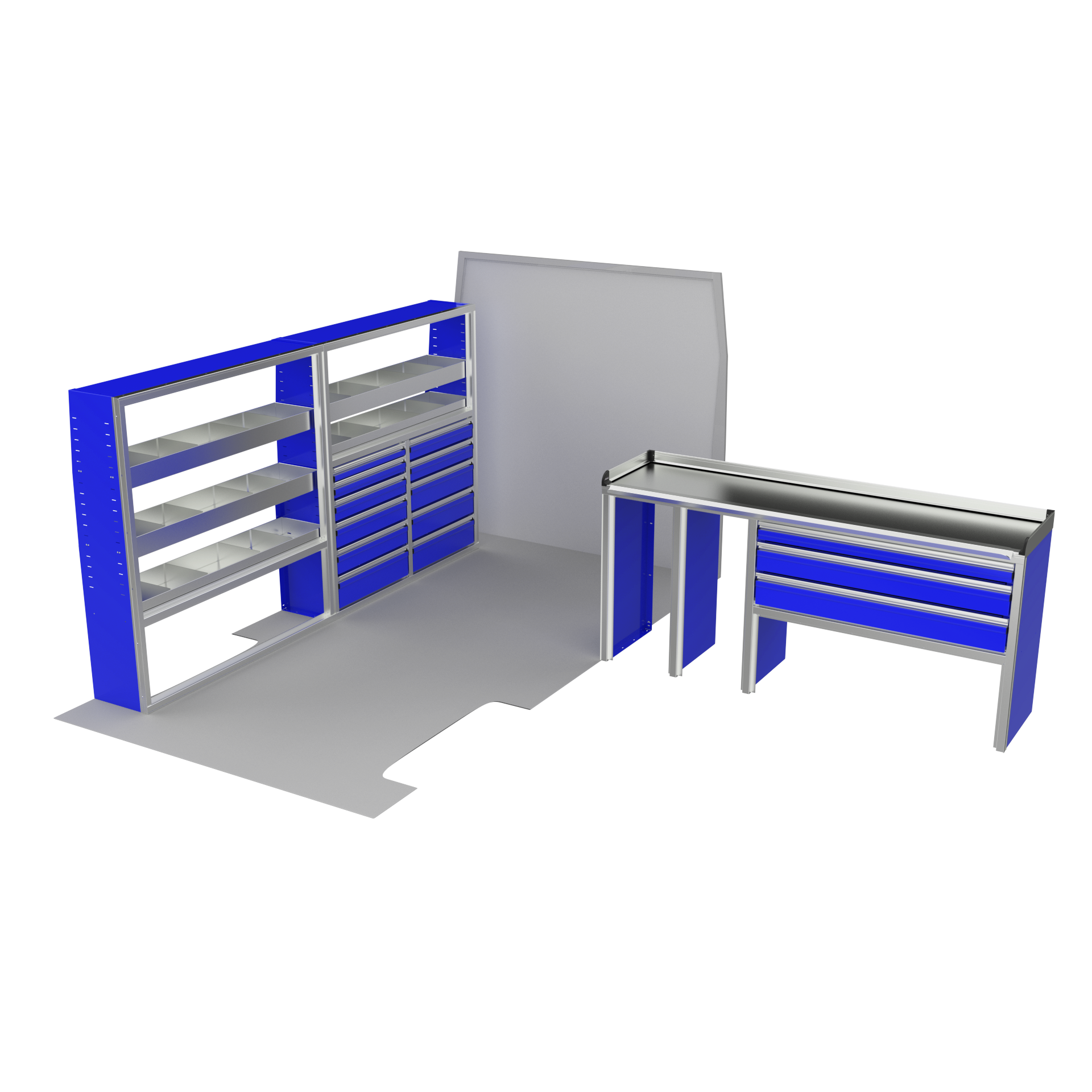 The VanPro Package RP2 includes the RP-300 Shelving Unit, RP-301 Shelving Unit, RP-303 Workbench, and RP-304 Drawer Housing for a comprehensive, efficient storage and workspace solution. Designed for the Ram ProMaster 2500/3500, this package features adjustable shelving, MotionGlide technology, and MotionLatch™ drawers for secure, easy-access organization. Constructed from lightweight, corrosion-resistant aluminum, it offers long-lasting durability, providing the flexibility and reliability your work van needs.