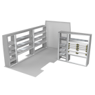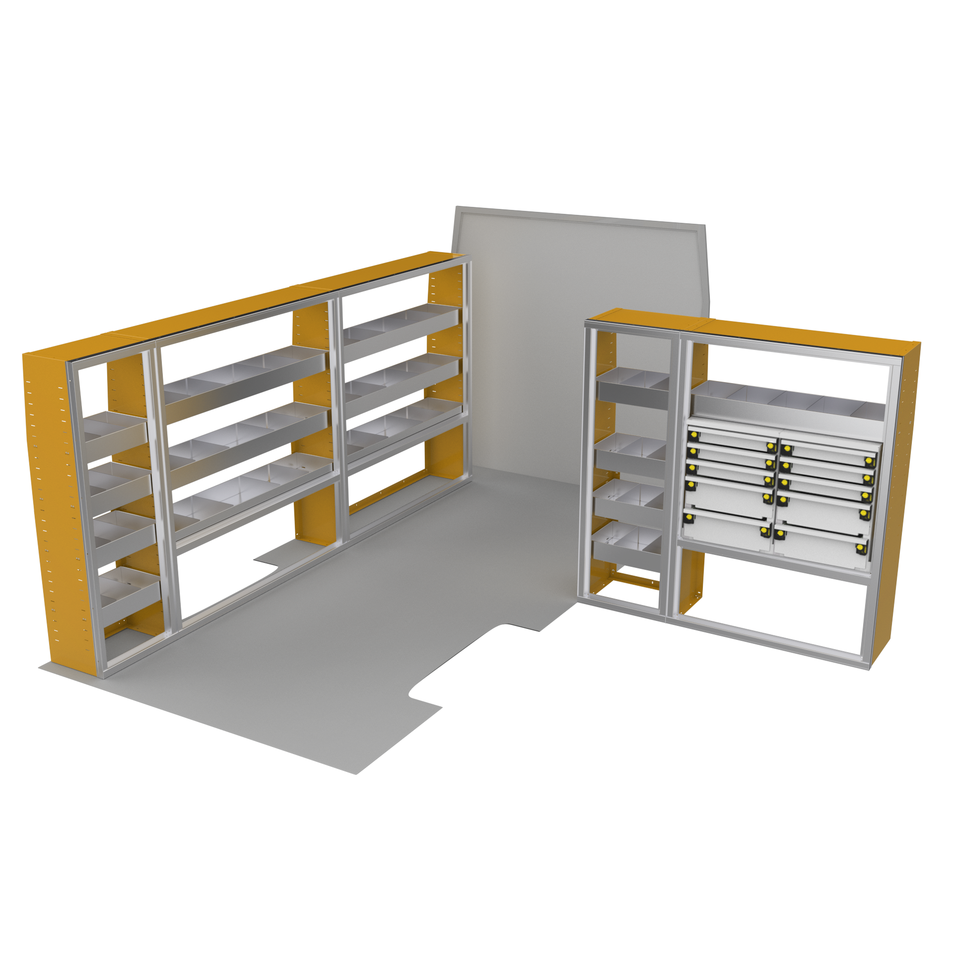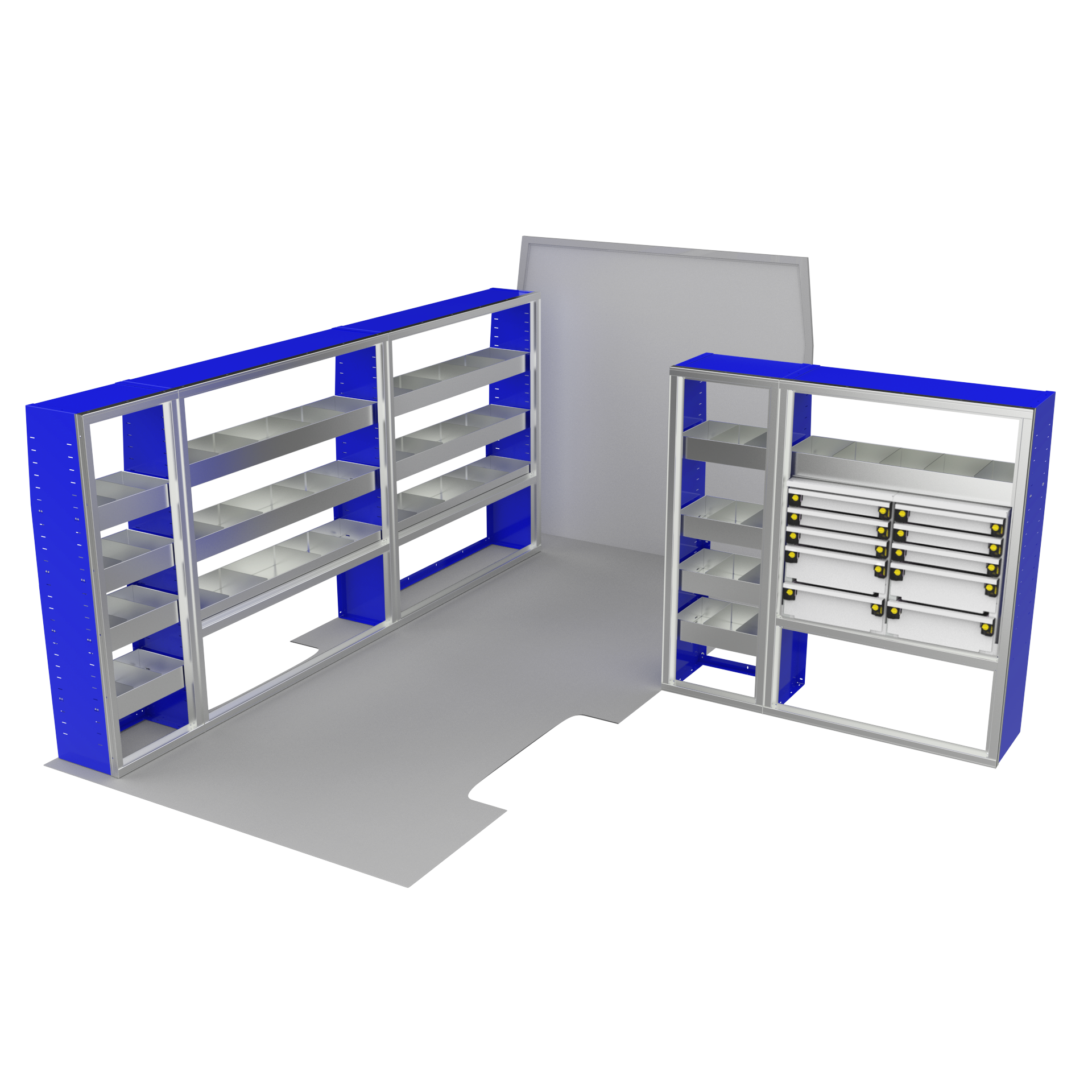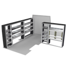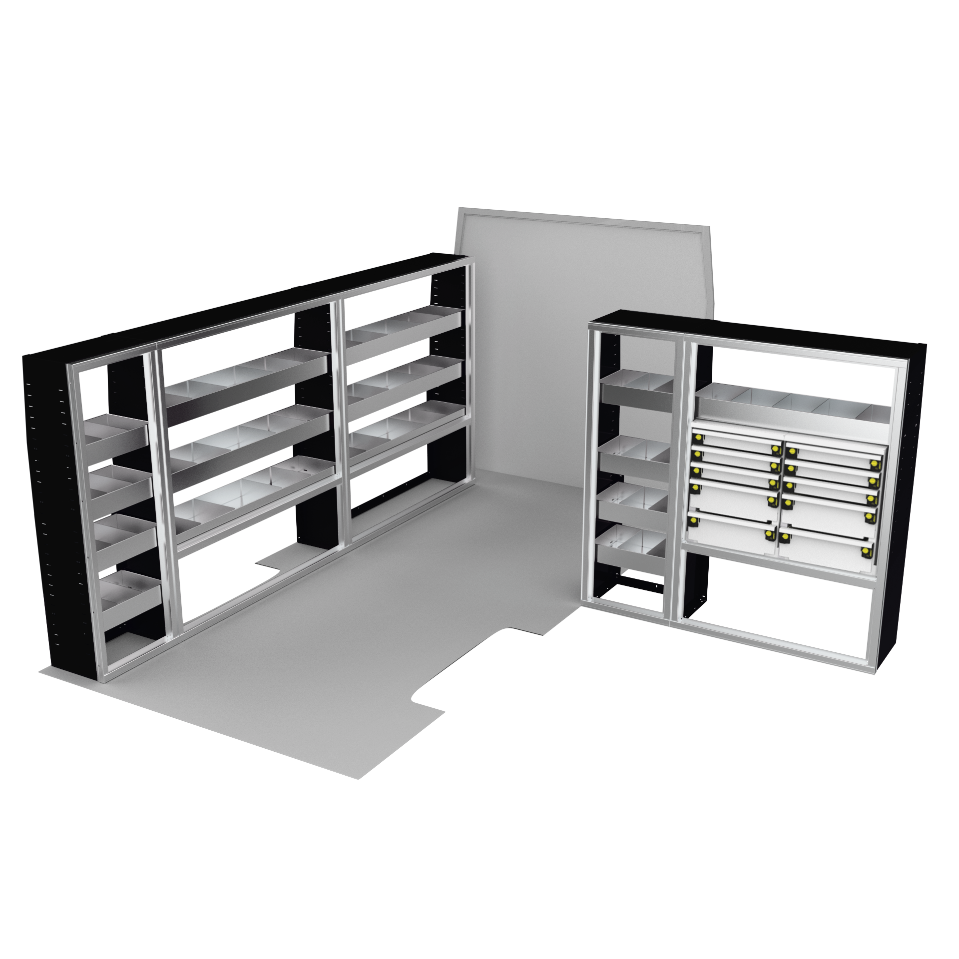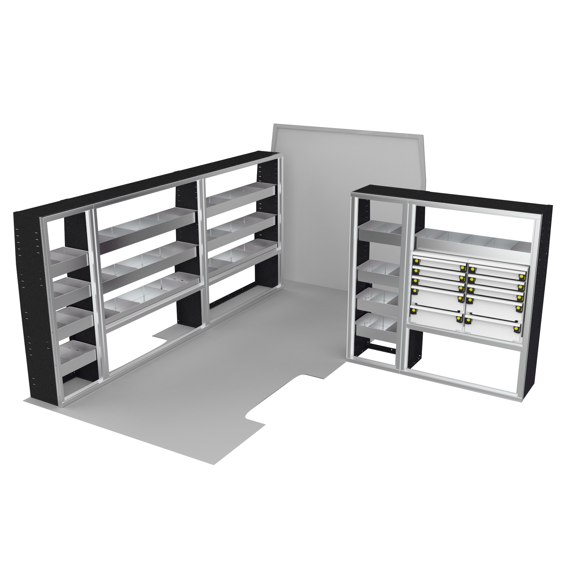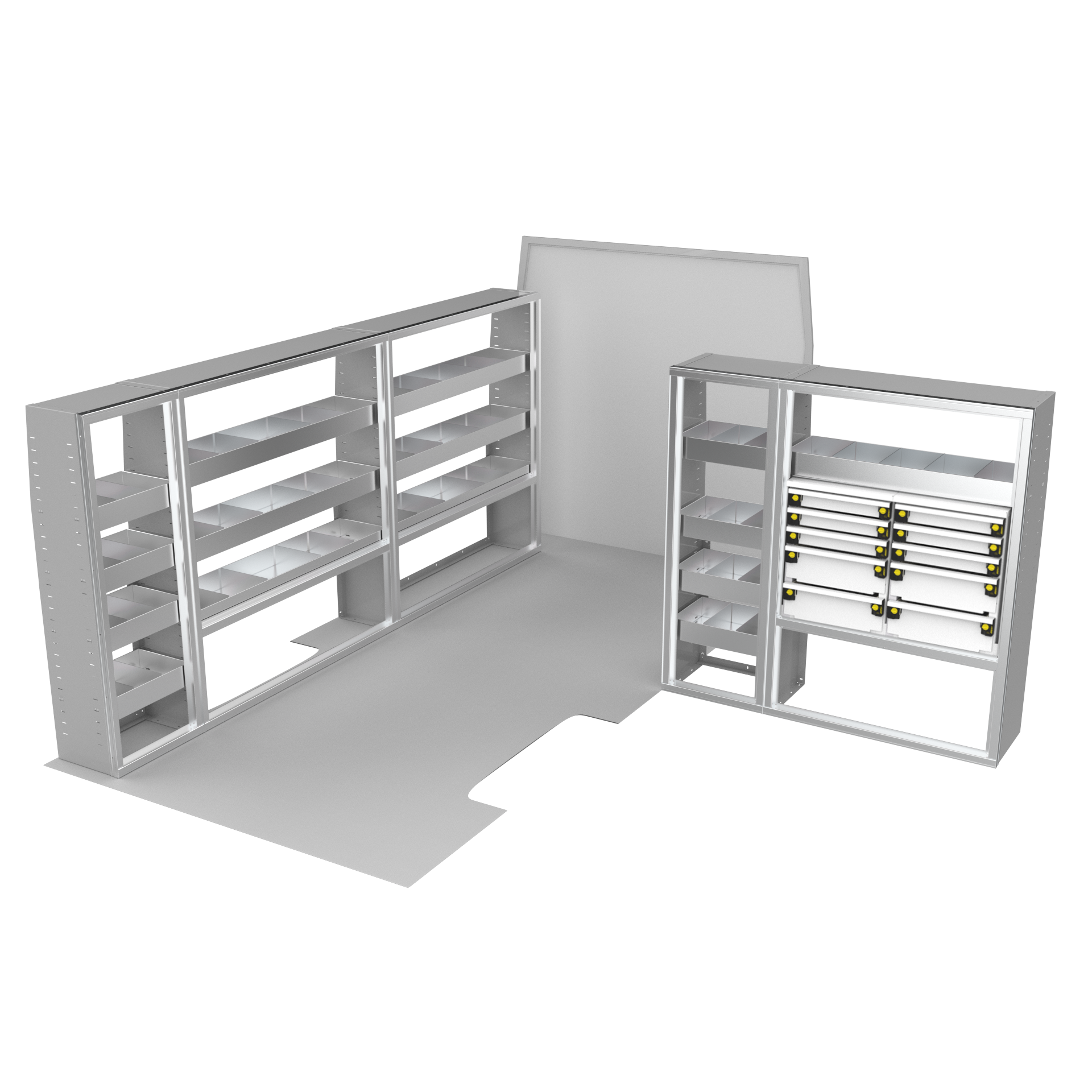 The VanPro Package RPEXT1 combines the RP300, RP-301, RP-305, and RP-306 units, offering a complete storage solution for the Ram ProMaster 2500/3500 EXT. This package includes adjustable shelving, MotionGlide technology, open-face shelving, and secure drawers for flexible, efficient storage. Made from lightweight, corrosion-resistant aluminum, it maximizes your van's storage capacity while providing durable and easy-to-move organization for mobile businesses and service professional.