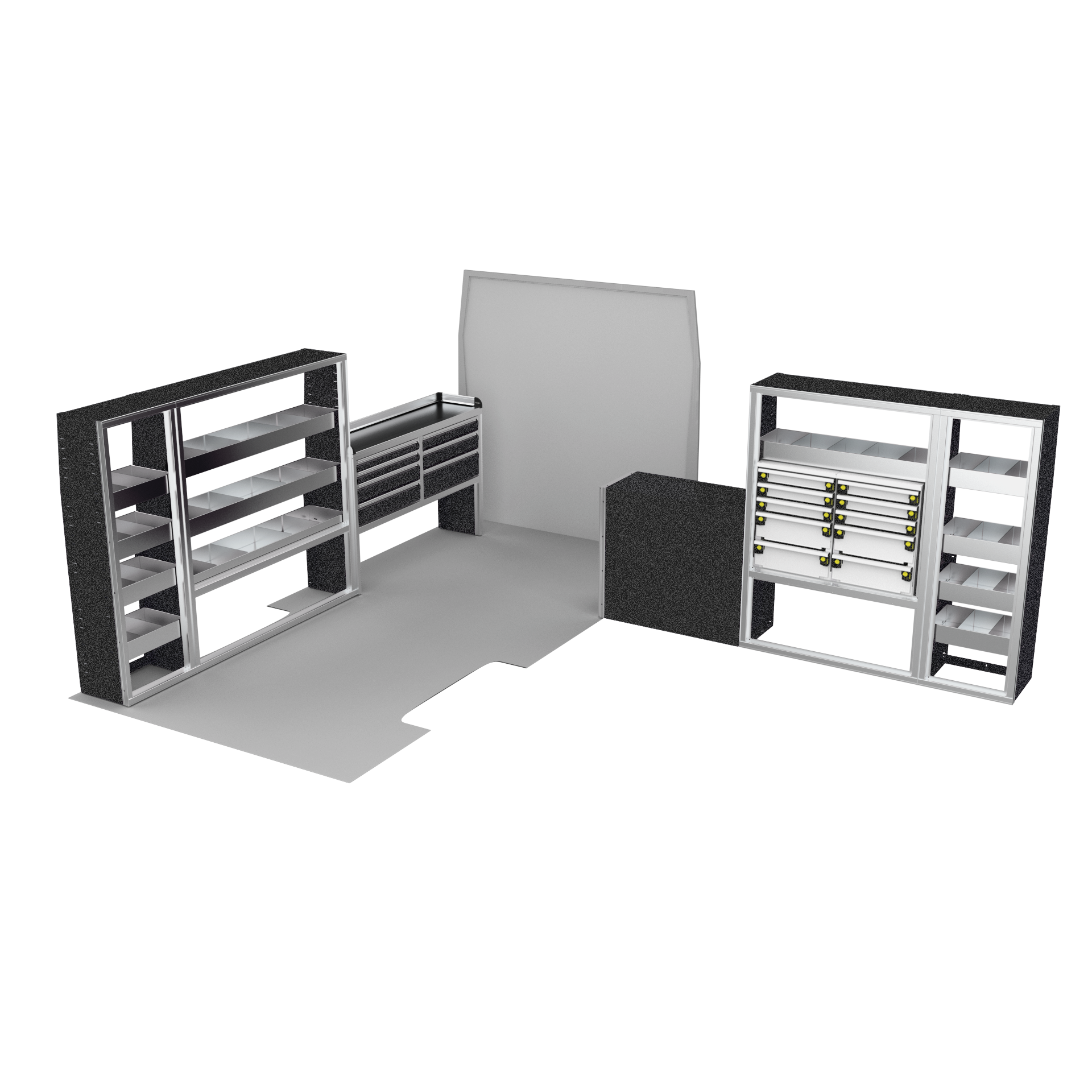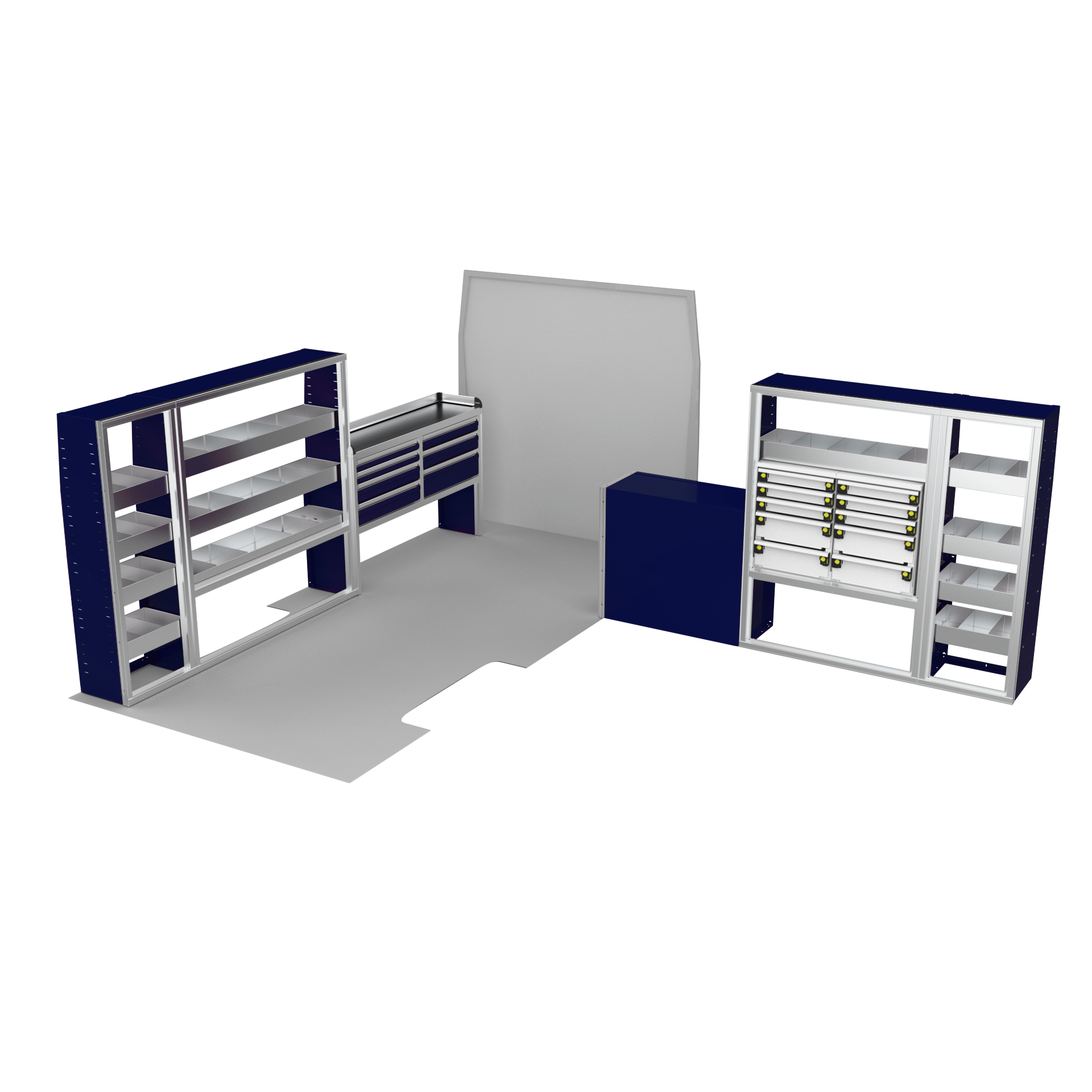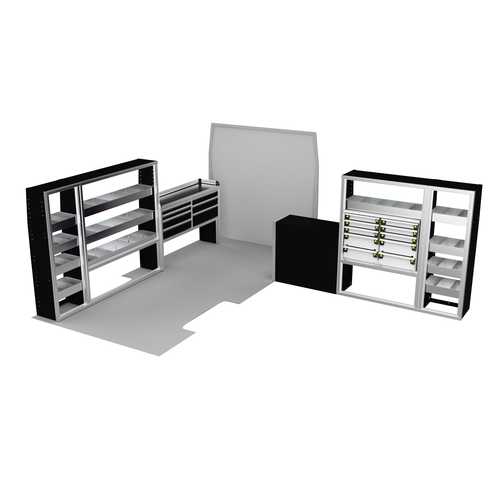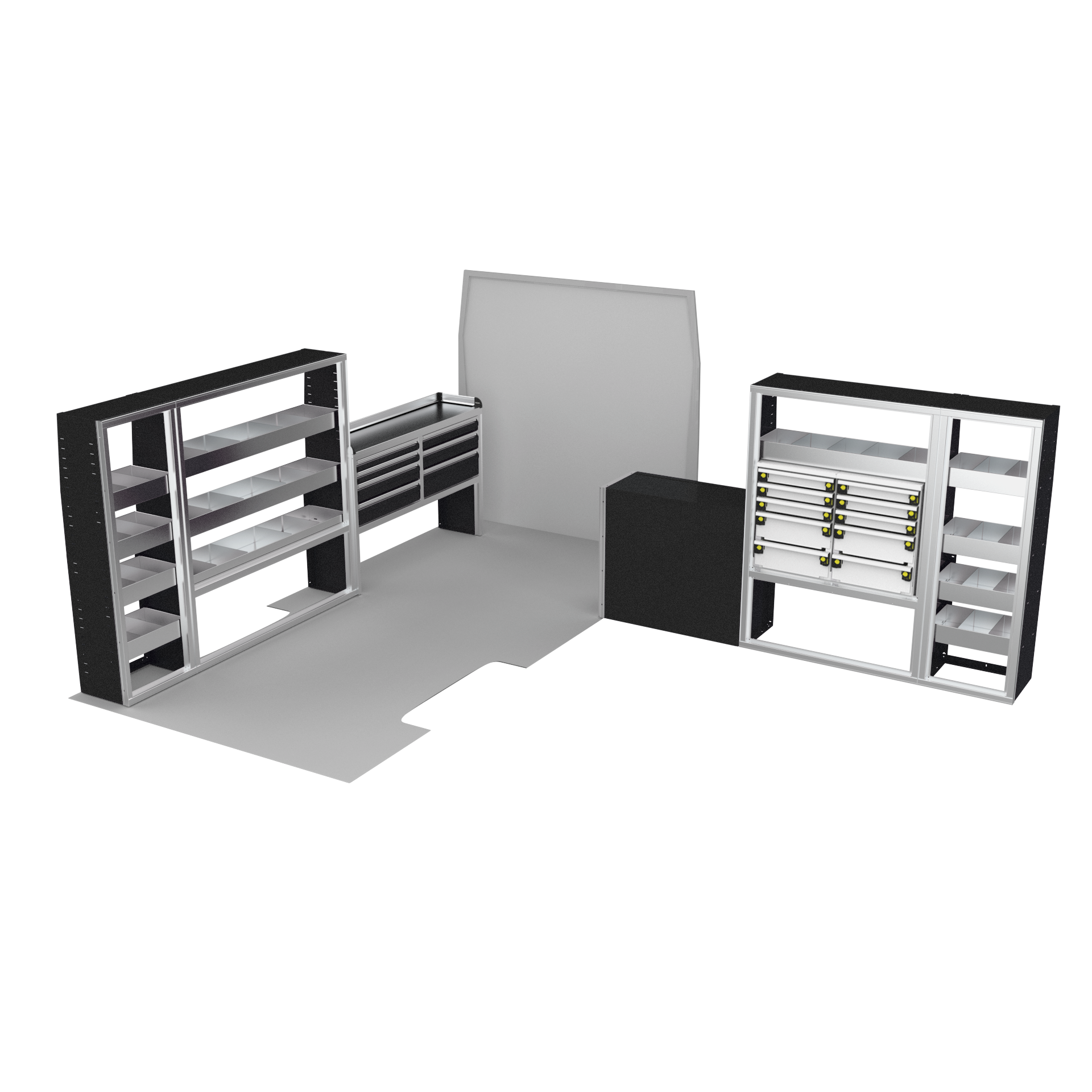 The VanPro Package RPEXT2 combines the RP-300 Shelving Unit, RP-301 Shelving Unit, RP-303 Workbench, RP-304 Drawer Housing, RP-305 Shelving Unit, and RP-306 Shelving Unit to provide a comprehensive, efficient storage and workspace solution for your Ram ProMaster 2500/3500 EXT. This package offers adjustable shelving, MotionGlide technology, secure drawer storage, and a spacious workbench, all built with lightweight, corrosion-resistant aluminum for maximum durability and efficiency. Ideal for work vans, this package ensures flexibility, reliable organization, and long-lasting performance.
