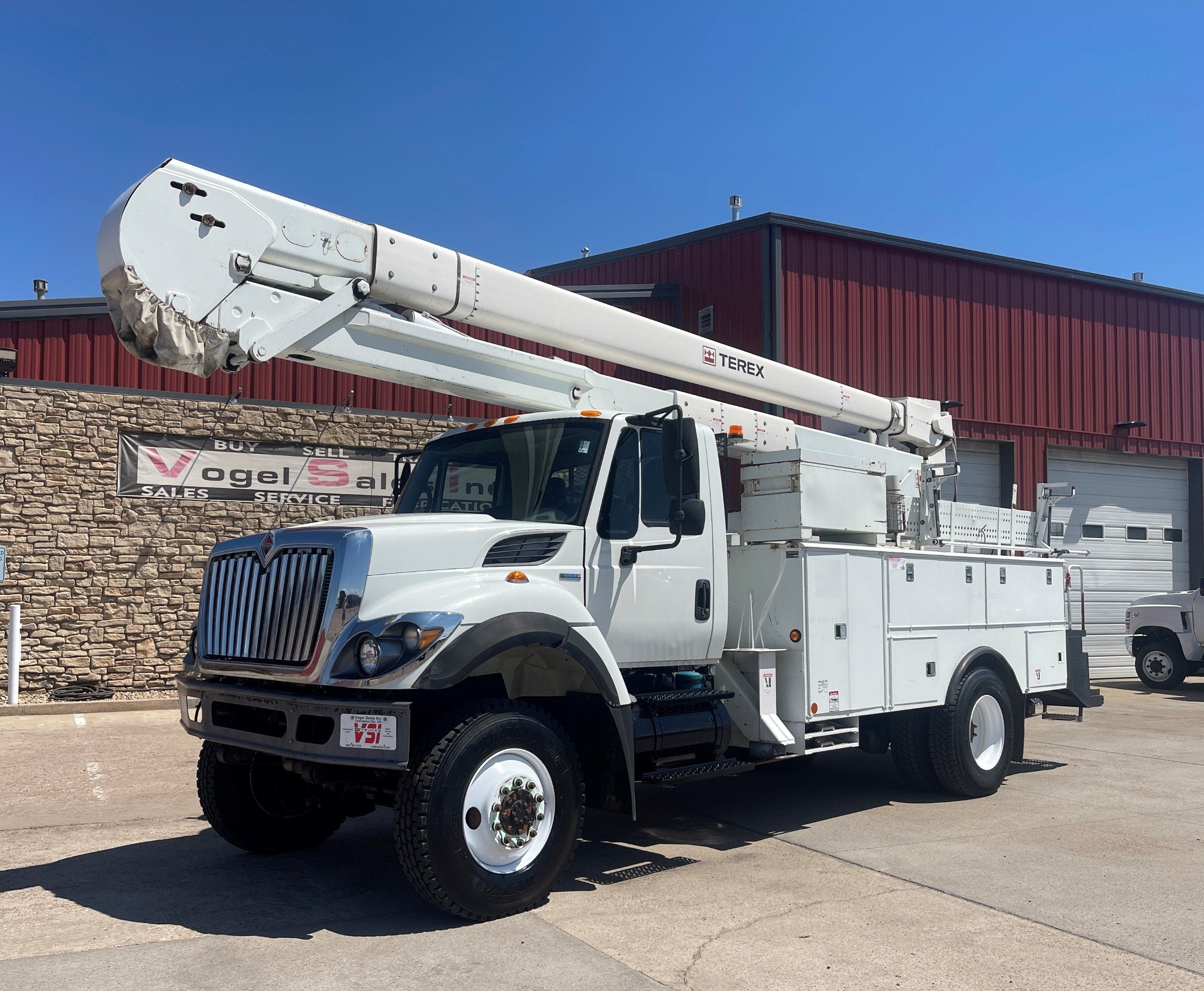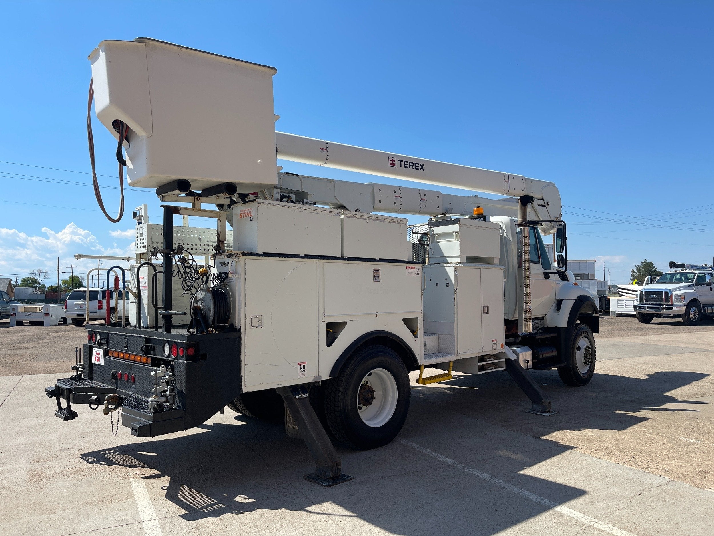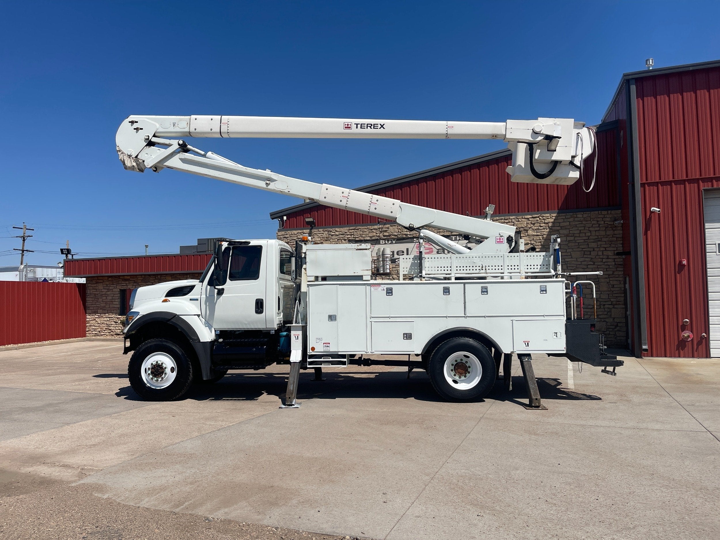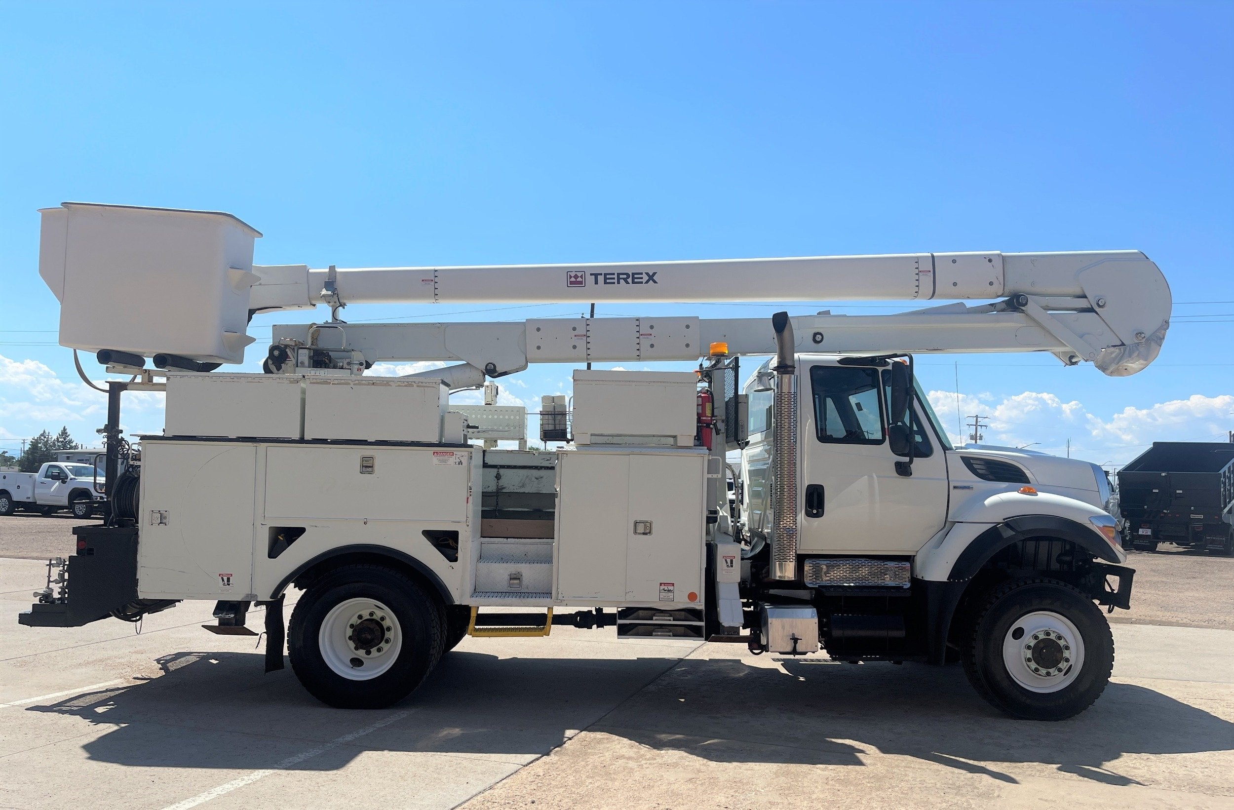 7.6L DT466 (260HP) / Allison 3000 Automatic Transmission / Cloth Driver Air Seat / Cloth Passenger Bench Seat / AM,FM,AUX Stereo / Cold AC / Manual Windows / Manual Locks / 15'ft Utility Box / 8 Locking Cabinets / Terex Hi-Ranger 52C-52 52ft Insulated (69KVAC) Bucket / Platform Capacity of up to 650 lb /4-Function Single Stick / Two Speed Throttle / 4 Hydraulic Outriggers / Receiver Hitch / Work Lights / Warning Strobes. / GVWR: 33,000lbs / Front Axle: 12,000lbs, / Rear Axle: 21,000lbs. / Steel Wheels / Tires: 11R22.5. and Much More !!