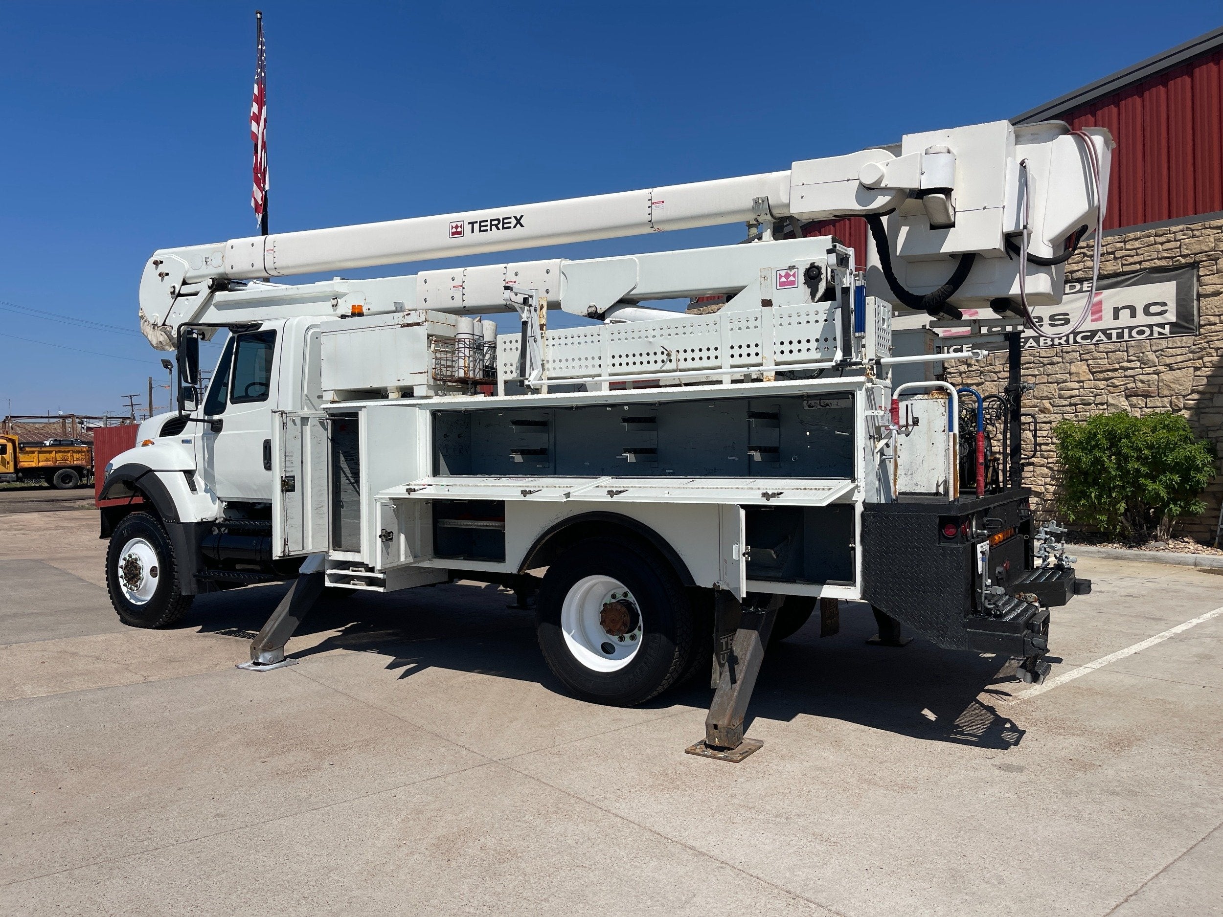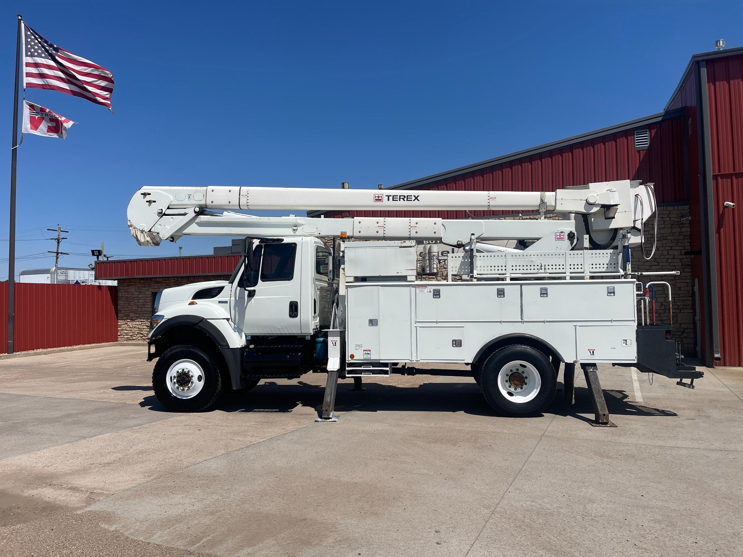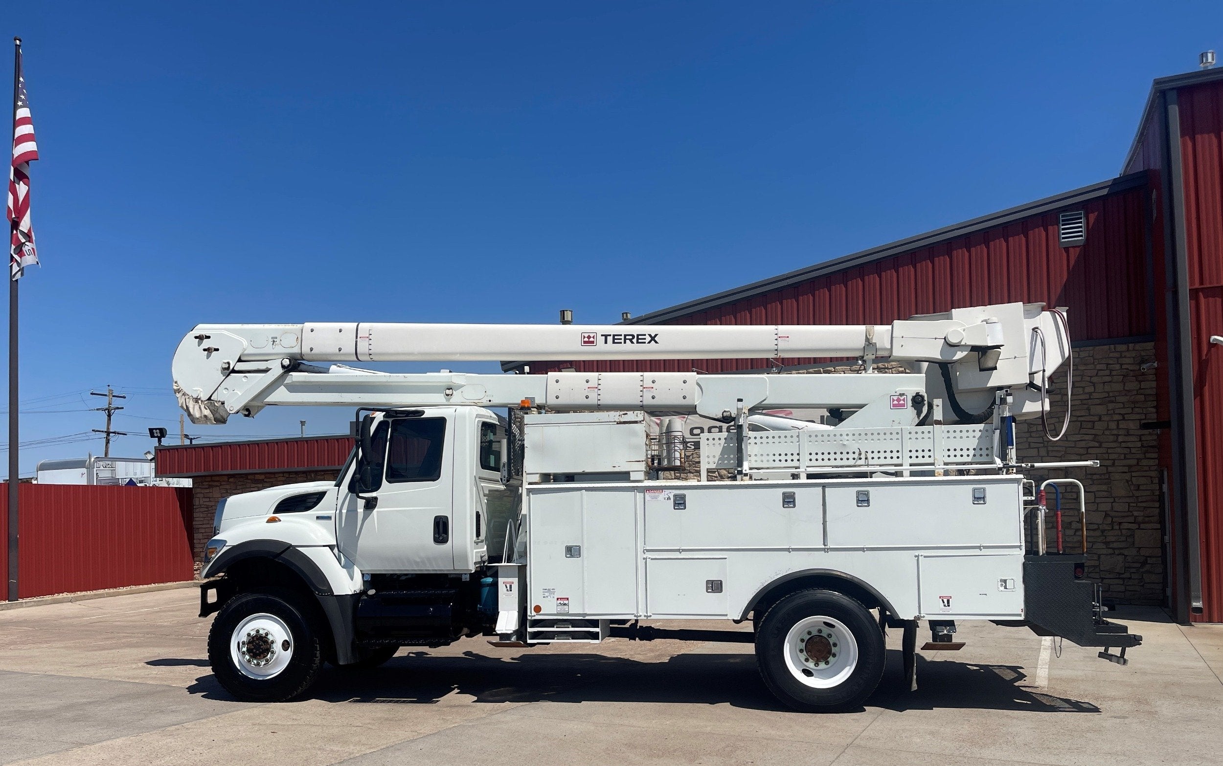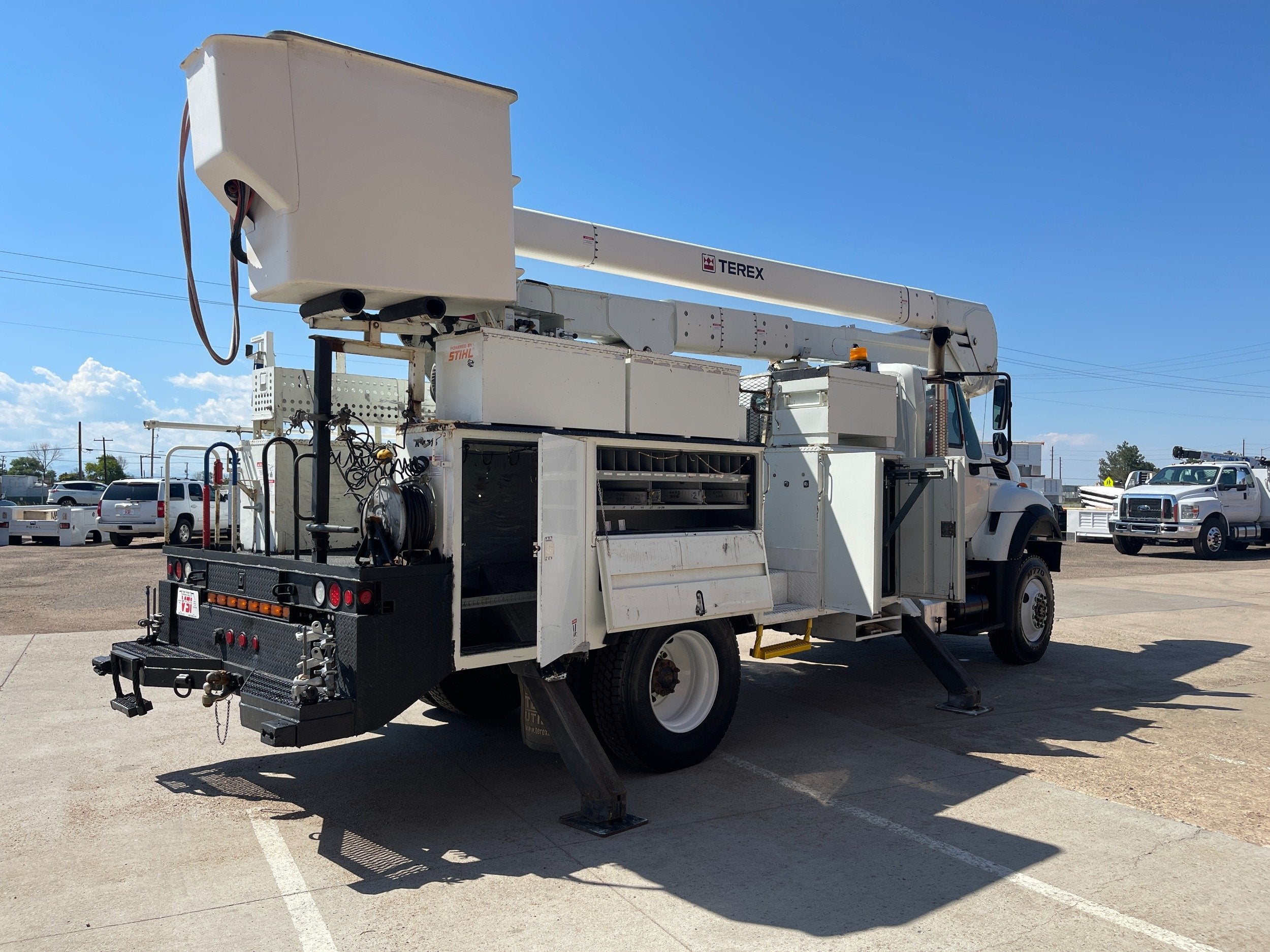 7.6L DT466 (260HP) / Allison 3000 Automatic Transmission / Cloth Driver Air Seat / Cloth Passenger Bench Seat / AM,FM,AUX Stereo / Cold AC / Manual Windows / Manual Locks / 15'ft Utility Box / 8 Locking Cabinets / Terex Hi-Ranger 52C-52 52ft Insulated (69KVAC) Bucket / Platform Capacity of up to 650 lb /4-Function Single Stick / Two Speed Throttle / 4 Hydraulic Outriggers / Receiver Hitch / Work Lights / Warning Strobes. / GVWR: 33,000lbs / Front Axle: 12,000lbs, / Rear Axle: 21,000lbs. / Steel Wheels / Tires: 11R22.5. and Much More !!