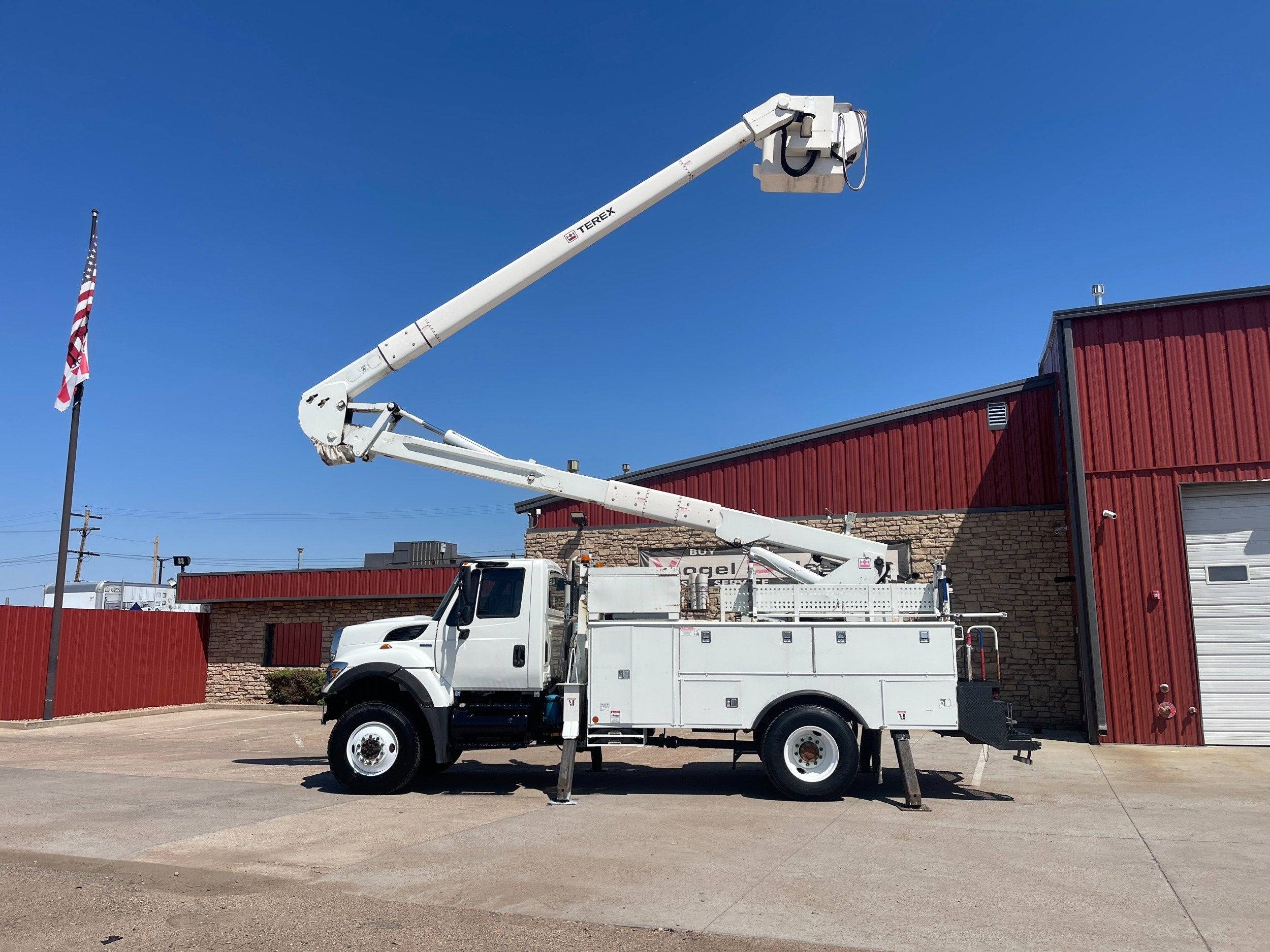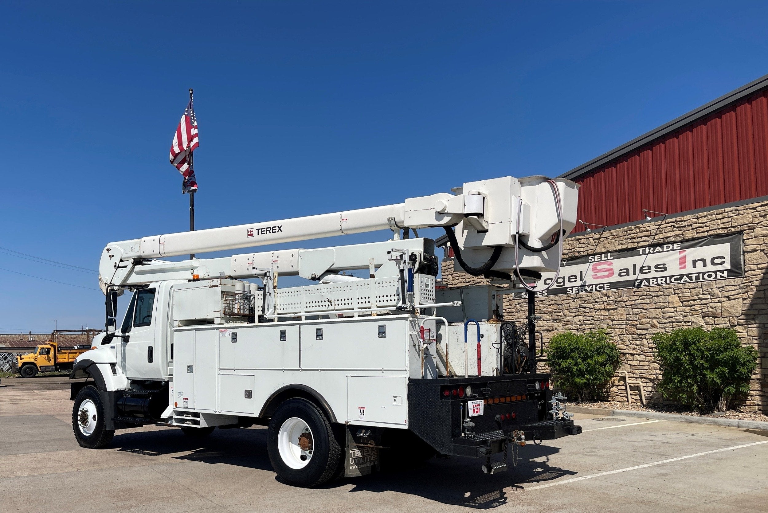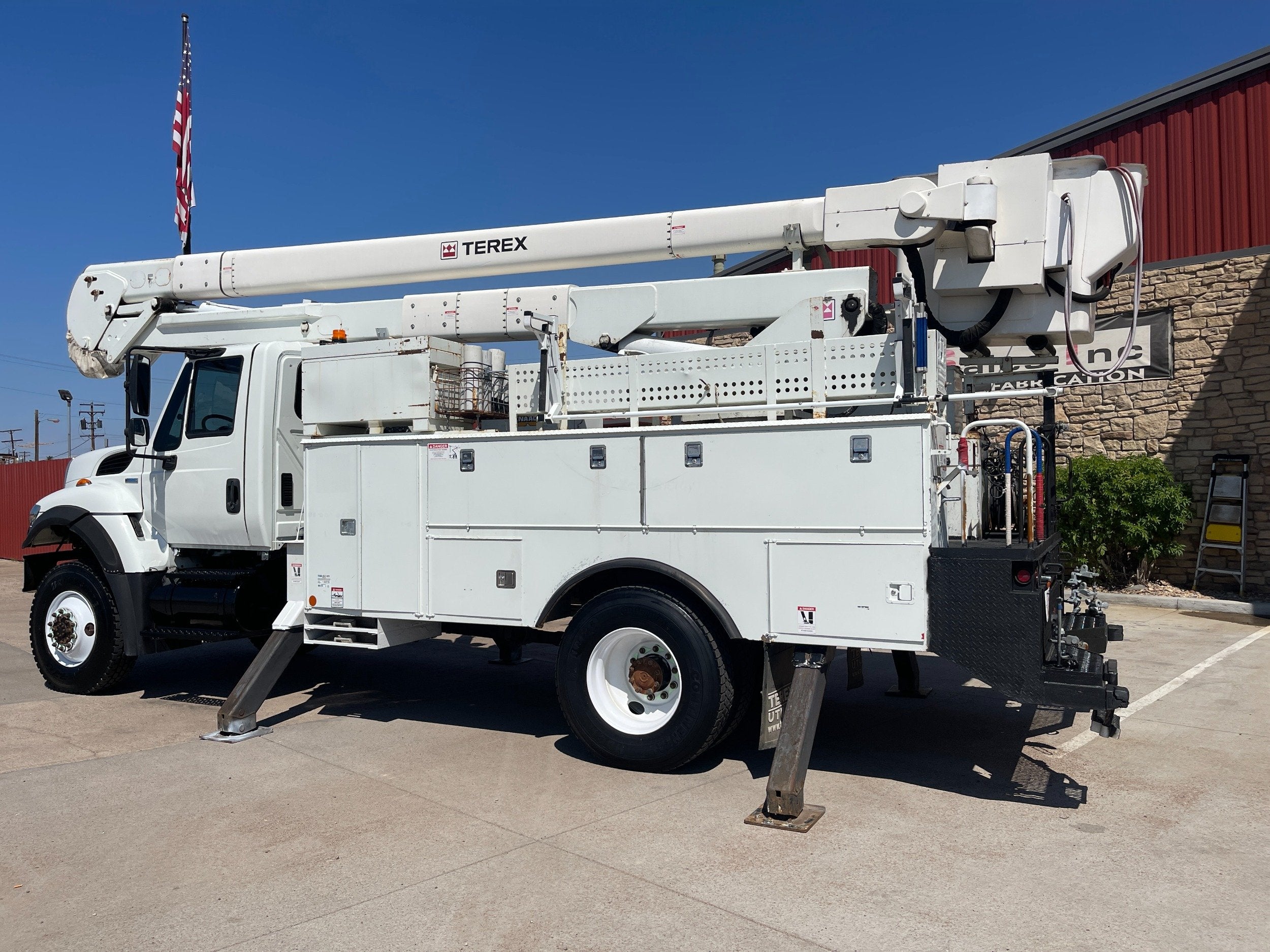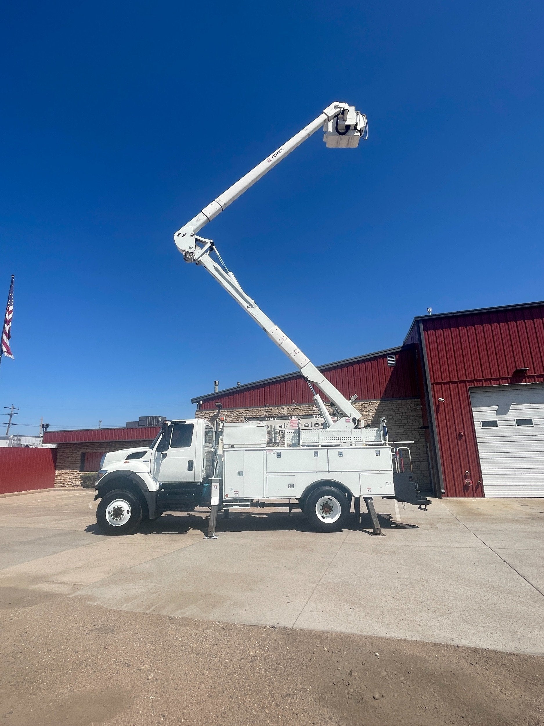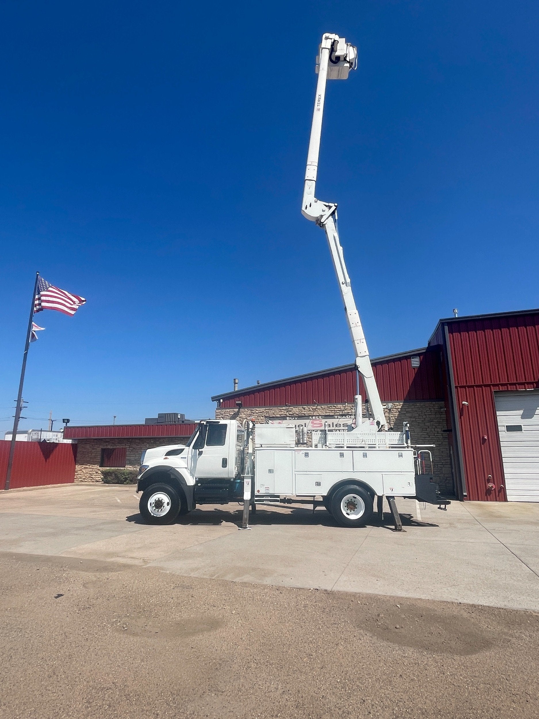 7.6L DT466 (260HP) / Allison 3000 Automatic Transmission / Cloth Driver Air Seat / Cloth Passenger Bench Seat / AM,FM,AUX Stereo / Cold AC / Manual Windows / Manual Locks / 15'ft Utility Box / 8 Locking Cabinets / Terex Hi-Ranger 52C-52 52ft Insulated (69KVAC) Bucket / Platform Capacity of up to 650 lb /4-Function Single Stick / Two Speed Throttle / 4 Hydraulic Outriggers / Receiver Hitch / Work Lights / Warning Strobes. / GVWR: 33,000lbs / Front Axle: 12,000lbs, / Rear Axle: 21,000lbs. / Steel Wheels / Tires: 11R22.5. and Much More !!