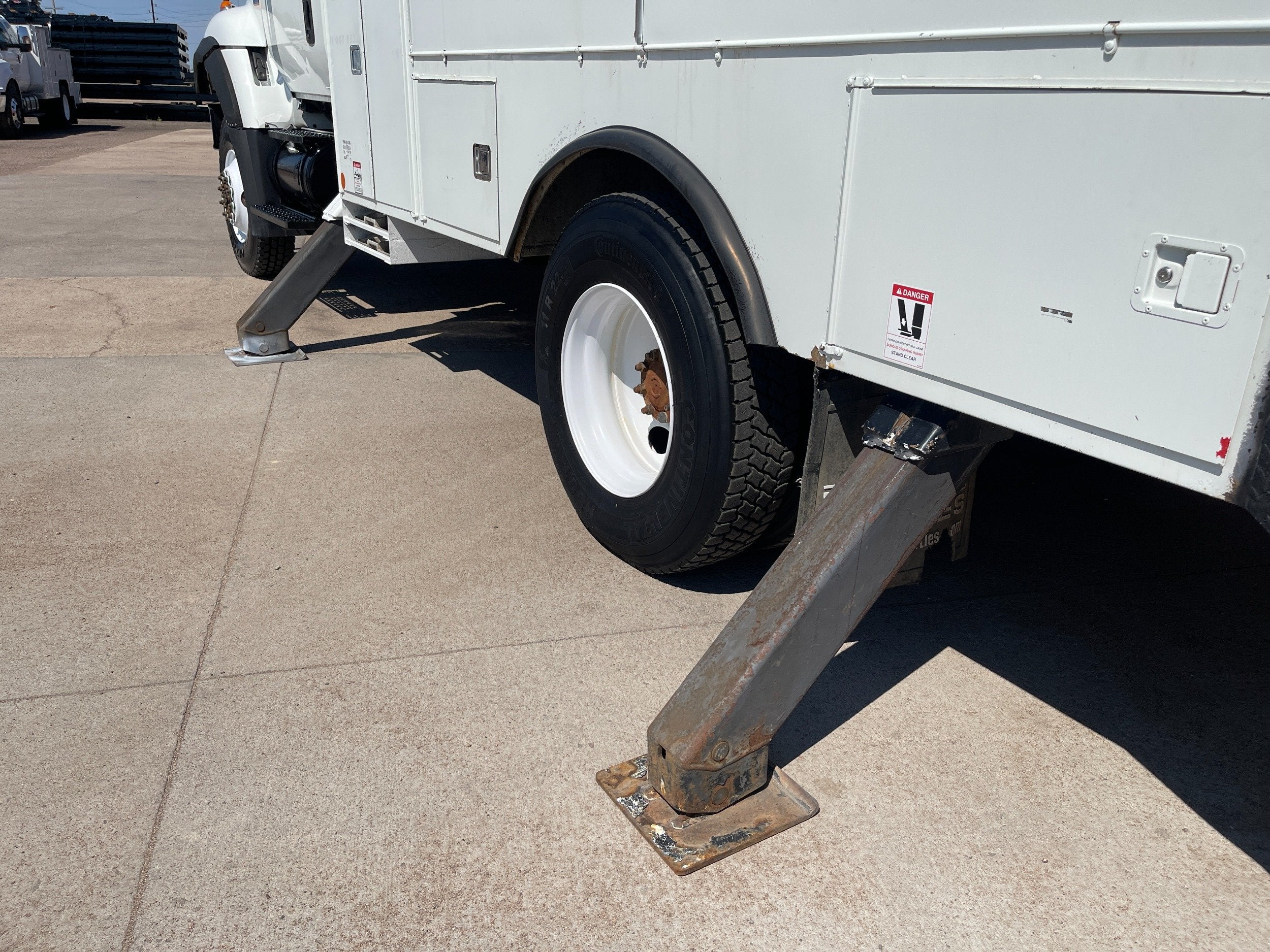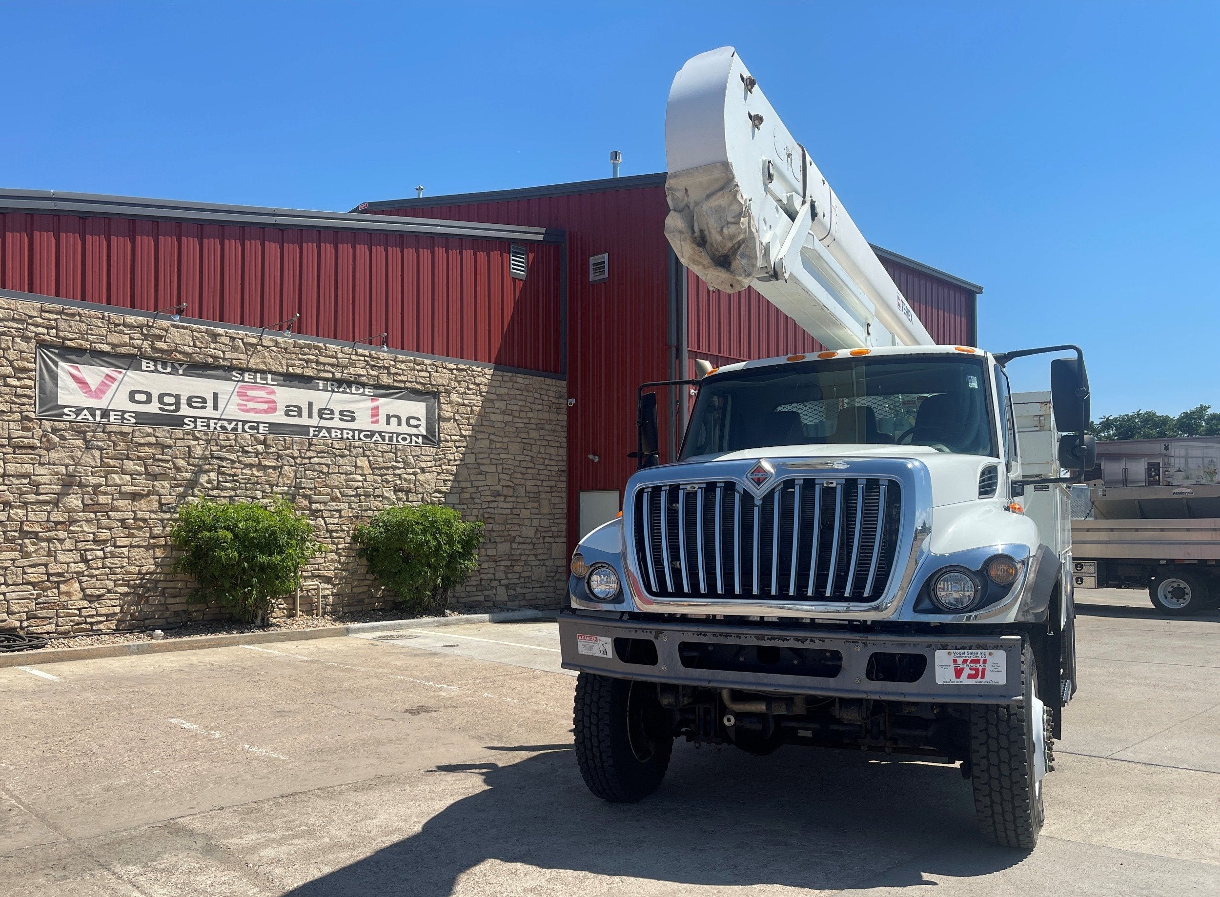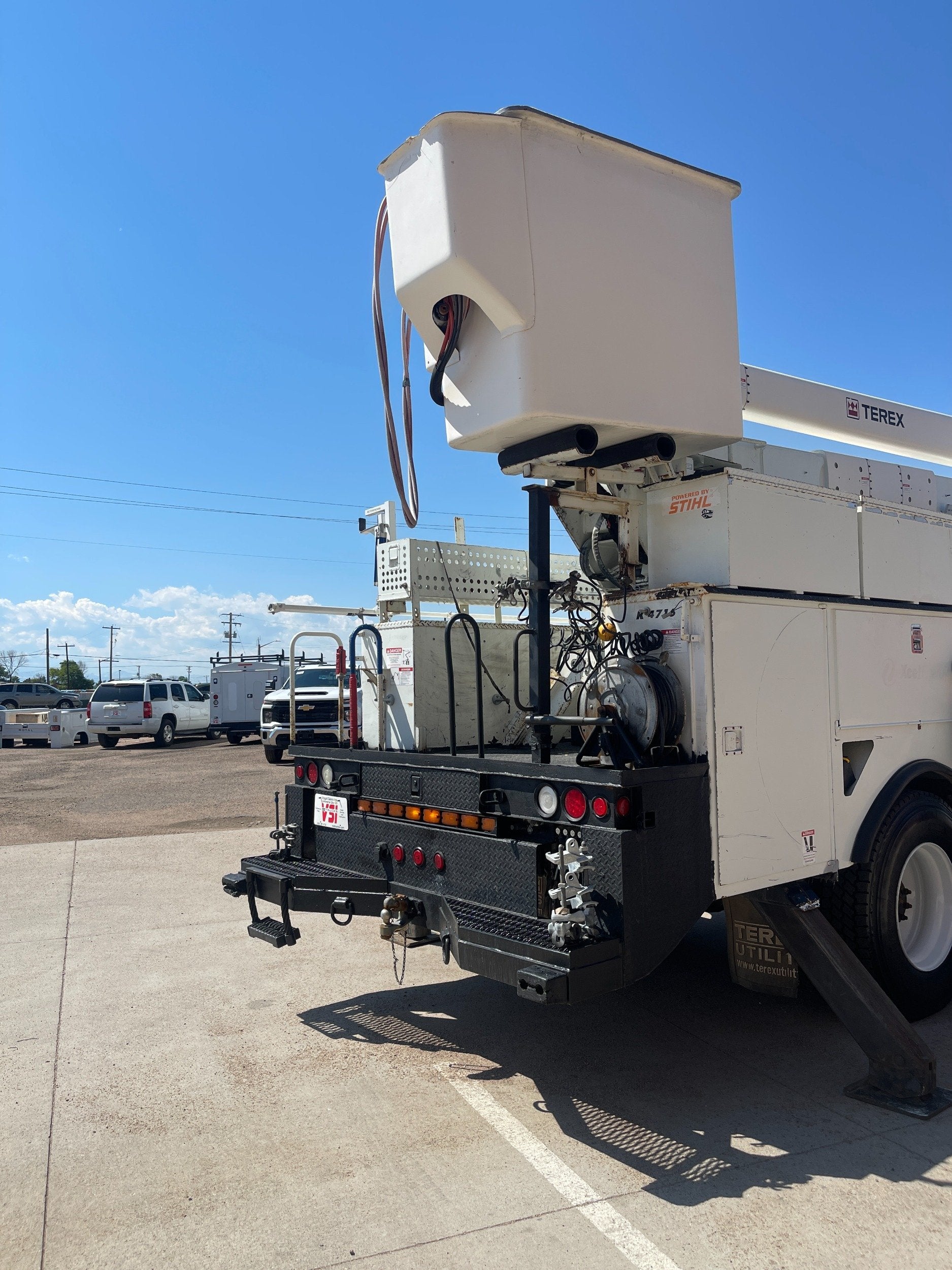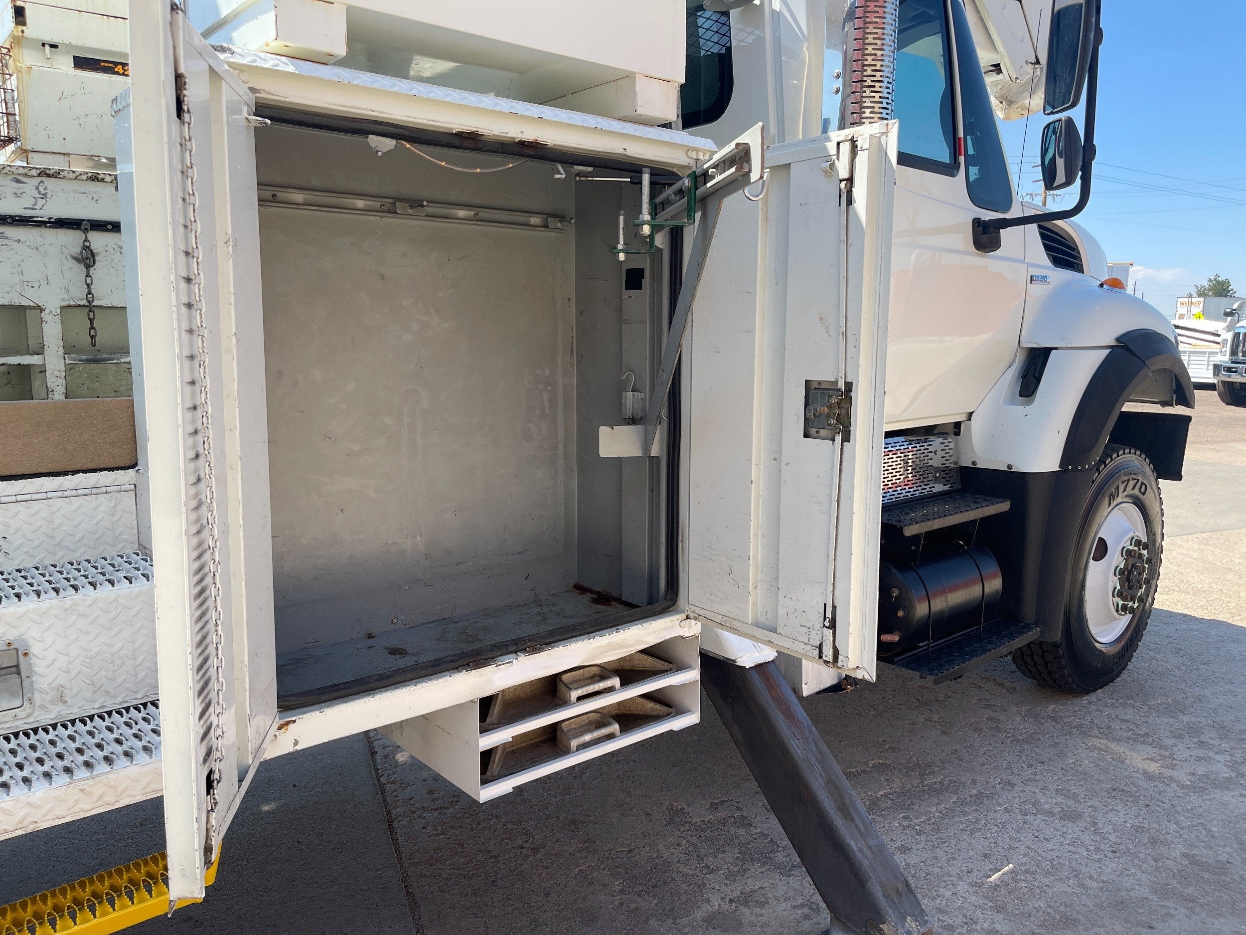 7.6L DT466 (260HP) / Allison 3000 Automatic Transmission / Cloth Driver Air Seat / Cloth Passenger Bench Seat / AM,FM,AUX Stereo / Cold AC / Manual Windows / Manual Locks / 15'ft Utility Box / 8 Locking Cabinets / Terex Hi-Ranger 52C-52 52ft Insulated (69KVAC) Bucket / Platform Capacity of up to 650 lb /4-Function Single Stick / Two Speed Throttle / 4 Hydraulic Outriggers / Receiver Hitch / Work Lights / Warning Strobes. / GVWR: 33,000lbs / Front Axle: 12,000lbs, / Rear Axle: 21,000lbs. / Steel Wheels / Tires: 11R22.5. and Much More !!