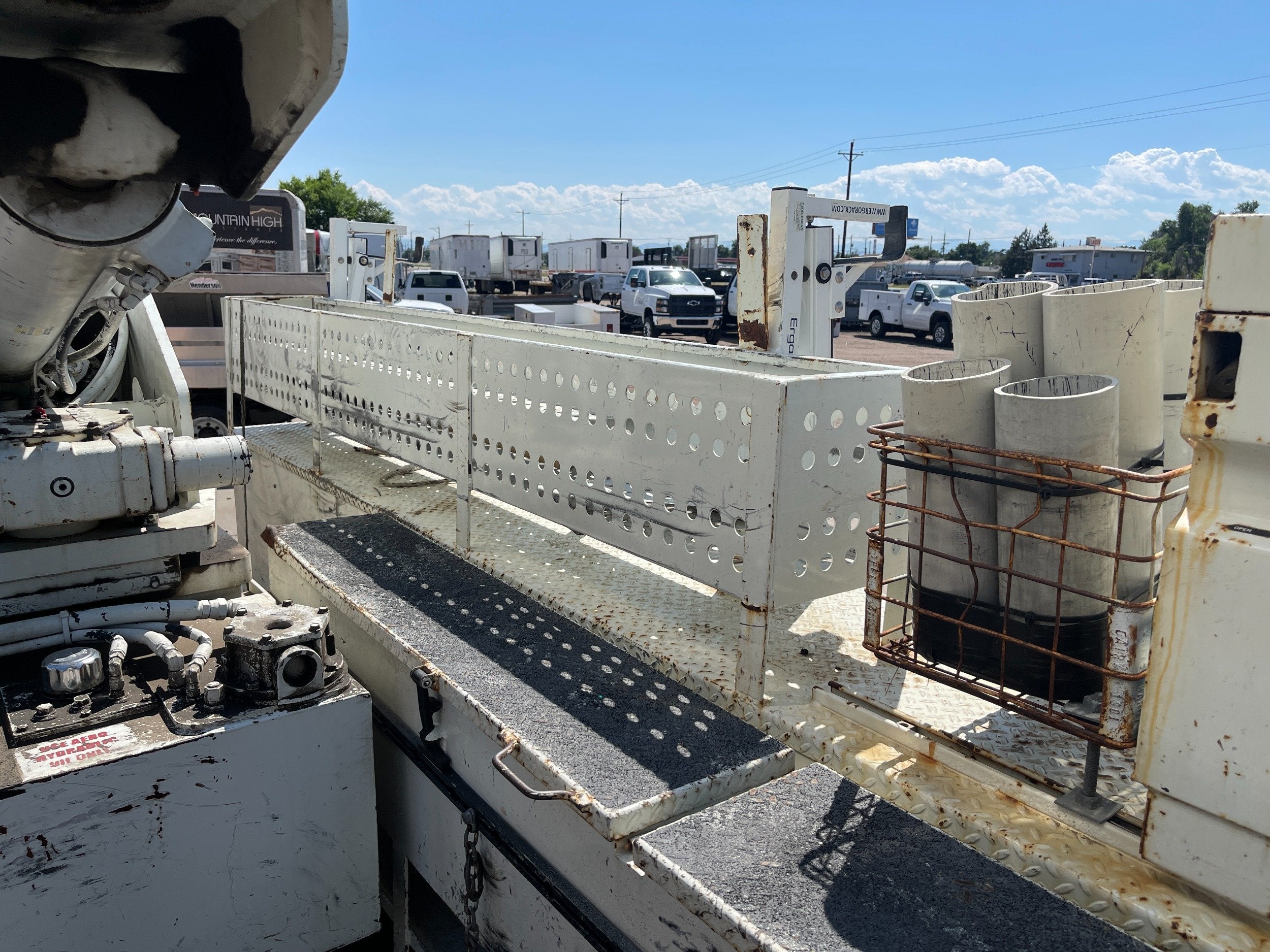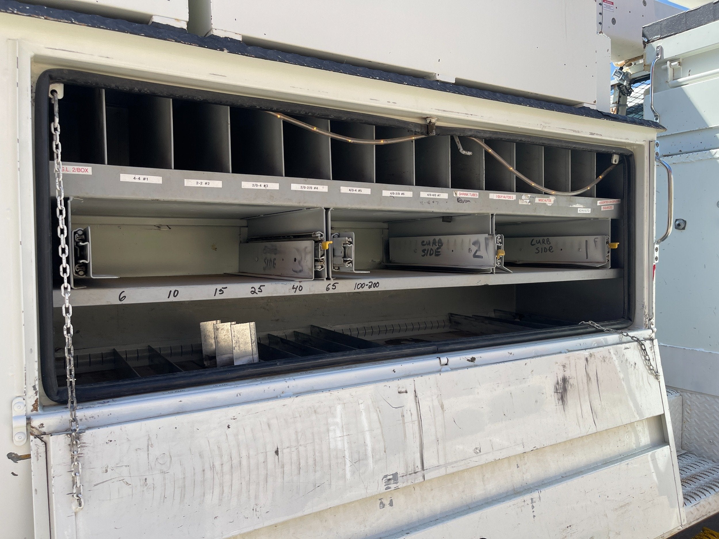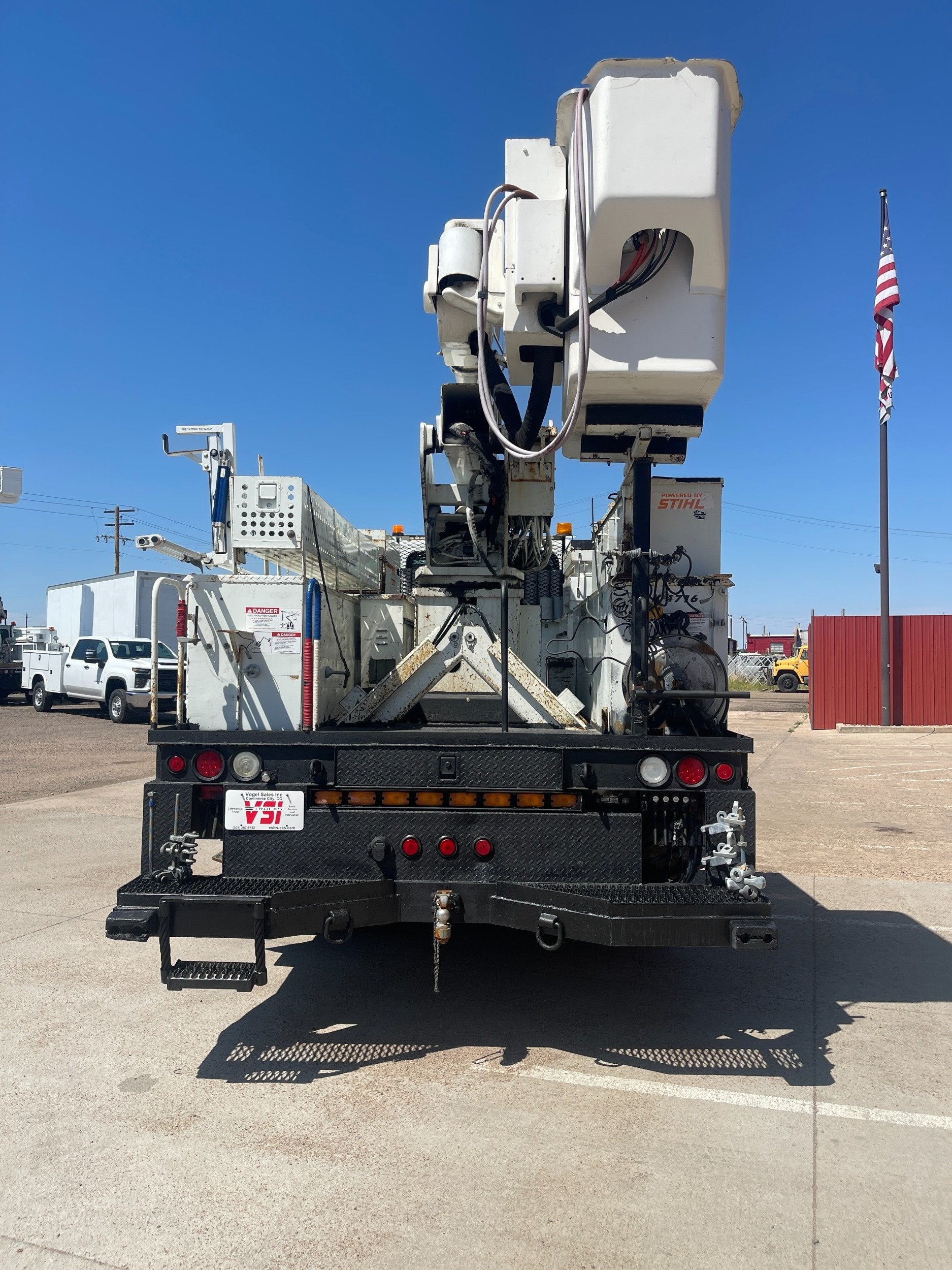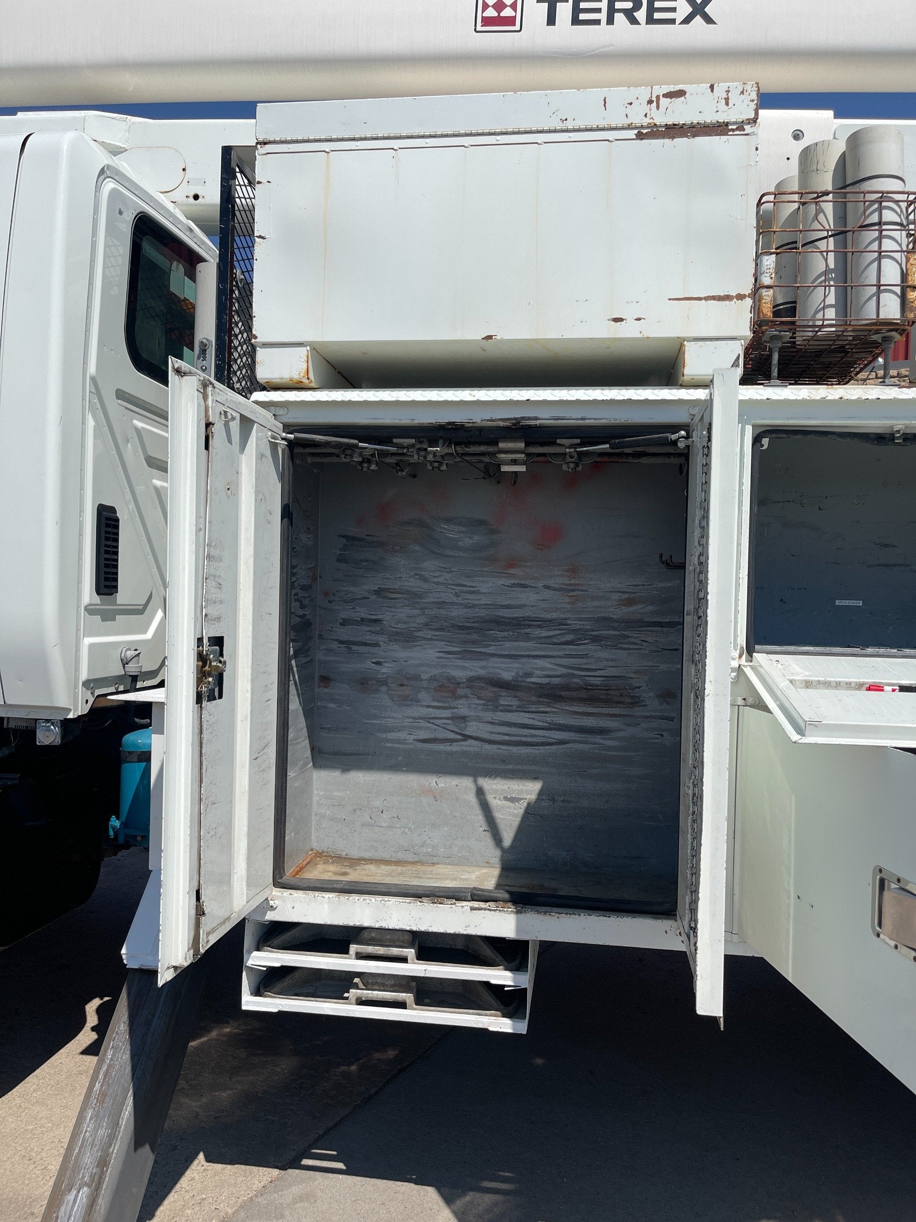 7.6L DT466 (260HP) / Allison 3000 Automatic Transmission / Cloth Driver Air Seat / Cloth Passenger Bench Seat / AM,FM,AUX Stereo / Cold AC / Manual Windows / Manual Locks / 15'ft Utility Box / 8 Locking Cabinets / Terex Hi-Ranger 52C-52 52ft Insulated (69KVAC) Bucket / Platform Capacity of up to 650 lb /4-Function Single Stick / Two Speed Throttle / 4 Hydraulic Outriggers / Receiver Hitch / Work Lights / Warning Strobes. / GVWR: 33,000lbs / Front Axle: 12,000lbs, / Rear Axle: 21,000lbs. / Steel Wheels / Tires: 11R22.5. and Much More !!