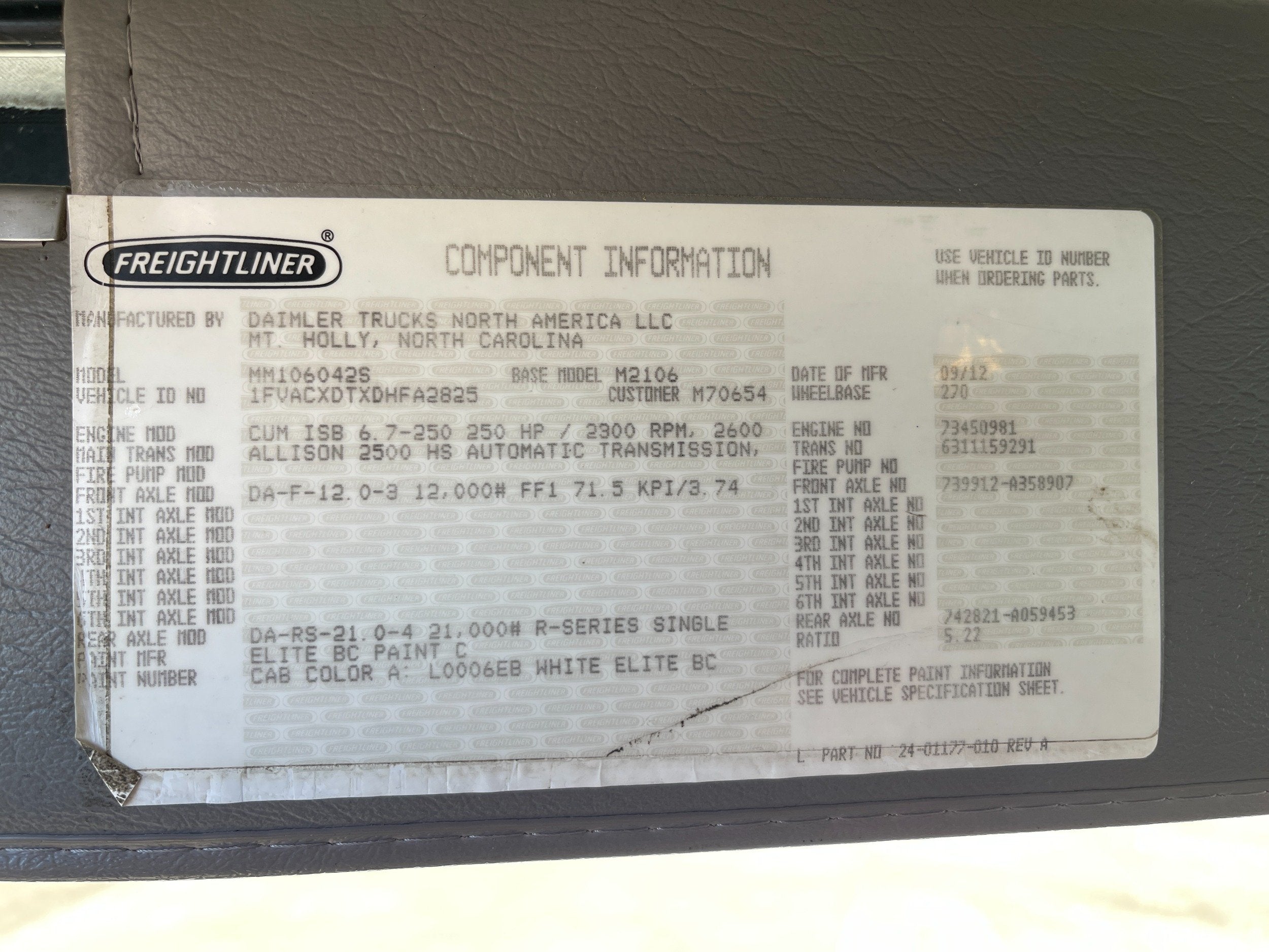 / 6.7L Cummins ISB-250 Turbo Diesel.. (250HP) / Automatic Transmission, / Cloth Drivers Air Seat / Bench Passenger Seat / Cruise Control / Cold AC / AM,FM,CD,AUX Stereo / 26'ft Morgan Dry Box (310" L x 98"W x 104"H) / Aluminum Walls / Wood Floor / Aluminum Roof / Roll Up Rear Door (94"W x 97"H) / Dock Height 49' / 60gal. Aluminum Fuel Tank. / 2,500lbs Tuck-Away Aluminum Liftgate (76" W x 45" D) / GVWR: 26,000lbs, / Front Axle: 10,000lbs, / Rear Axle: 16,000lbs. / 198" Cab to Axle / 270' Wheelbase / Tires: 295/75R22.5.