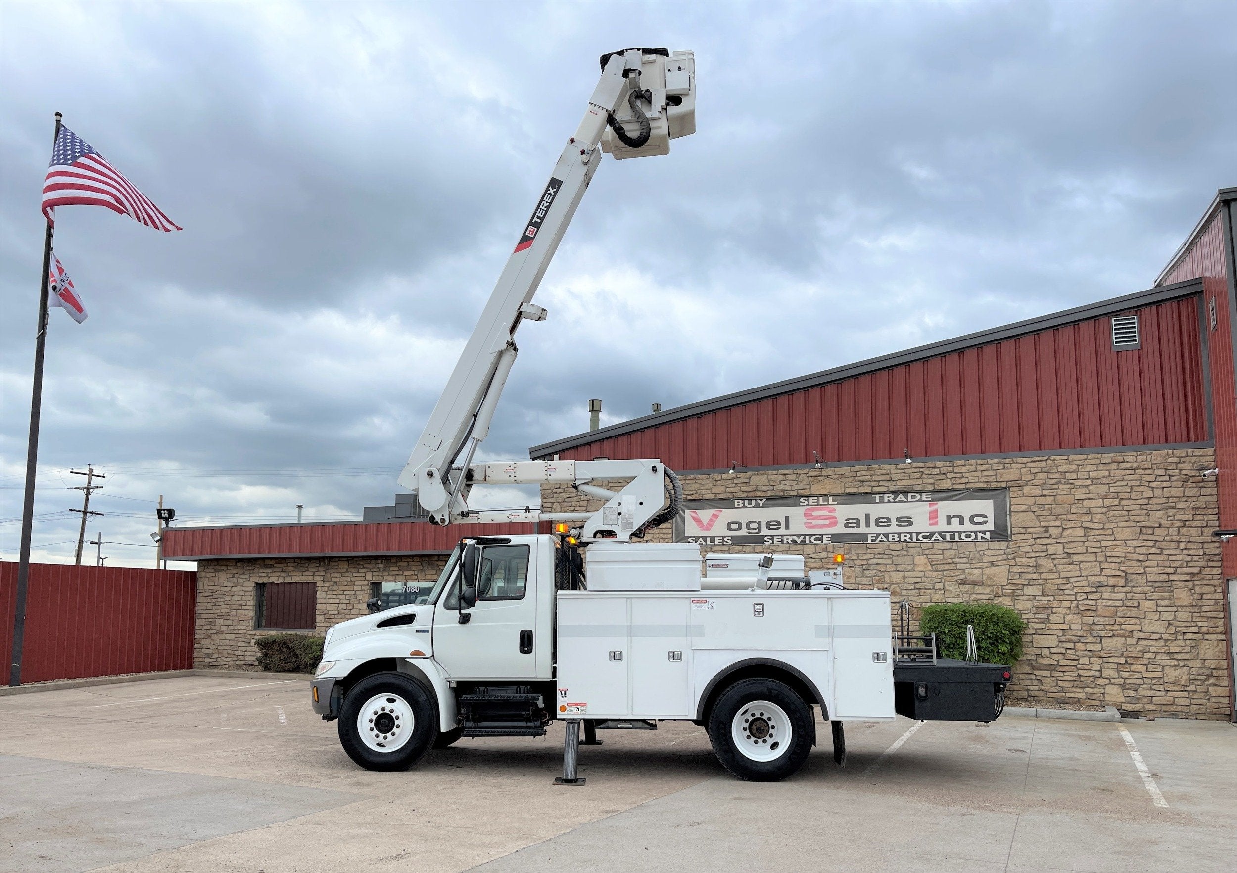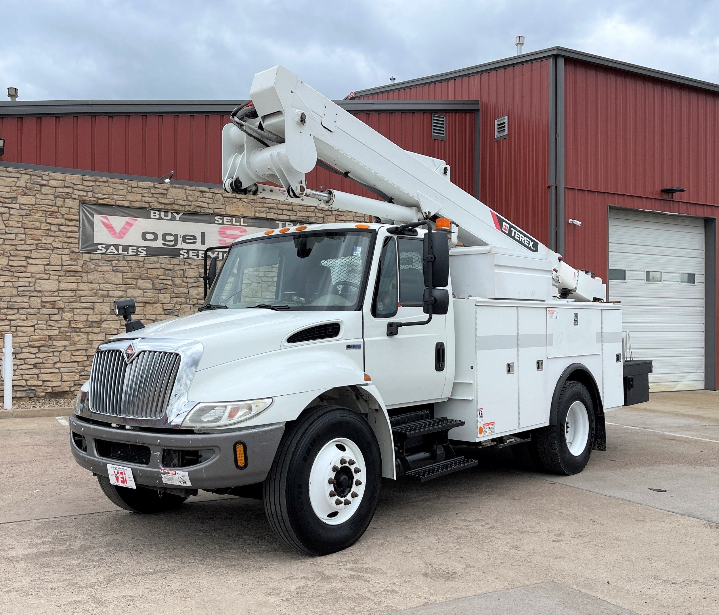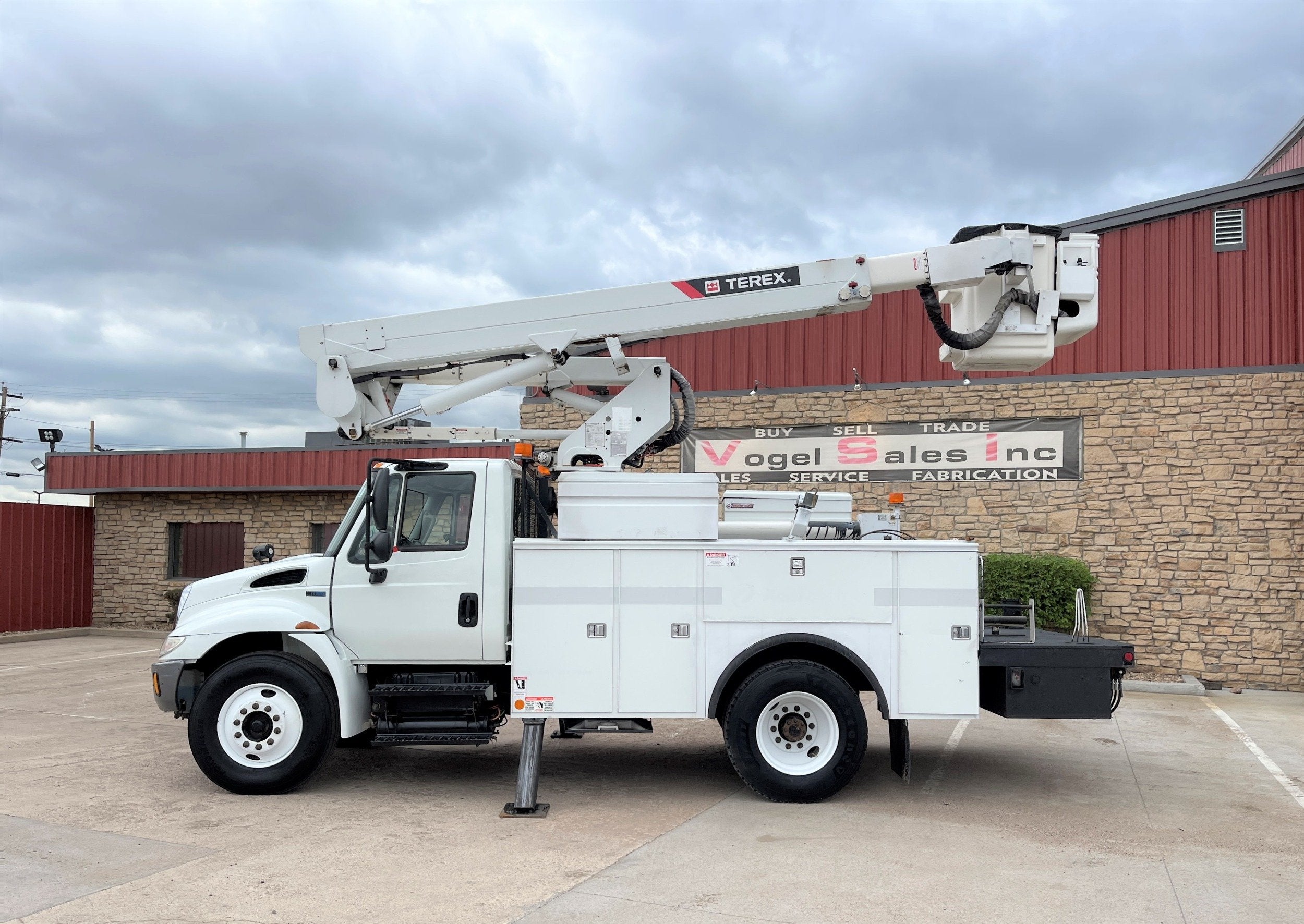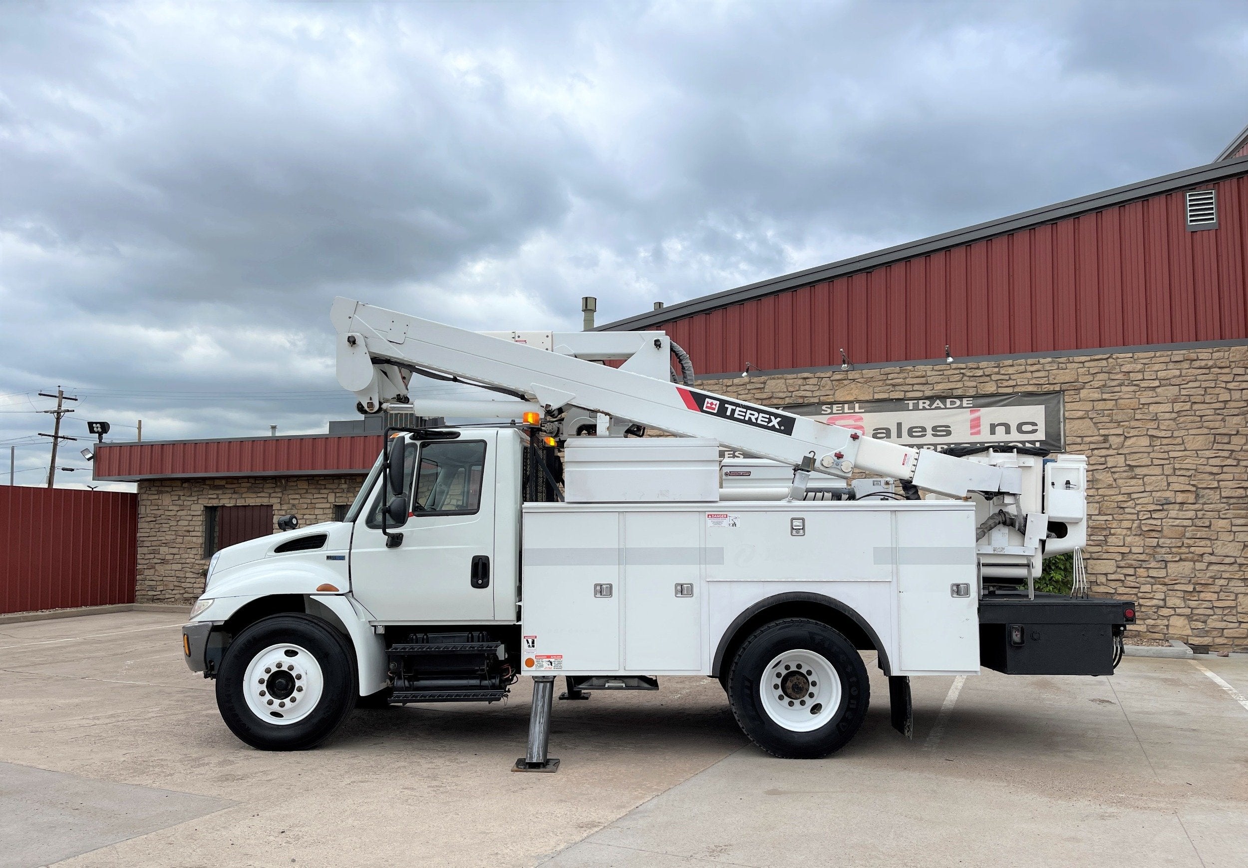 ** 2013 International 4300 Bucket Truck ** 7.6L DT466 (260HP) / Allison 3000 Automatic Transmission / Cloth Driver Air Seat / Cloth Passenger Seat / AM,FM,AUX Stereo / Cold AC / Manual Windows / Manual Locks / 14' Utility Box / 8 Locking Cabinets / Terex Hi-Ranger TL-41 41ft Bucket / Platform Capacity of up to 600 lb /